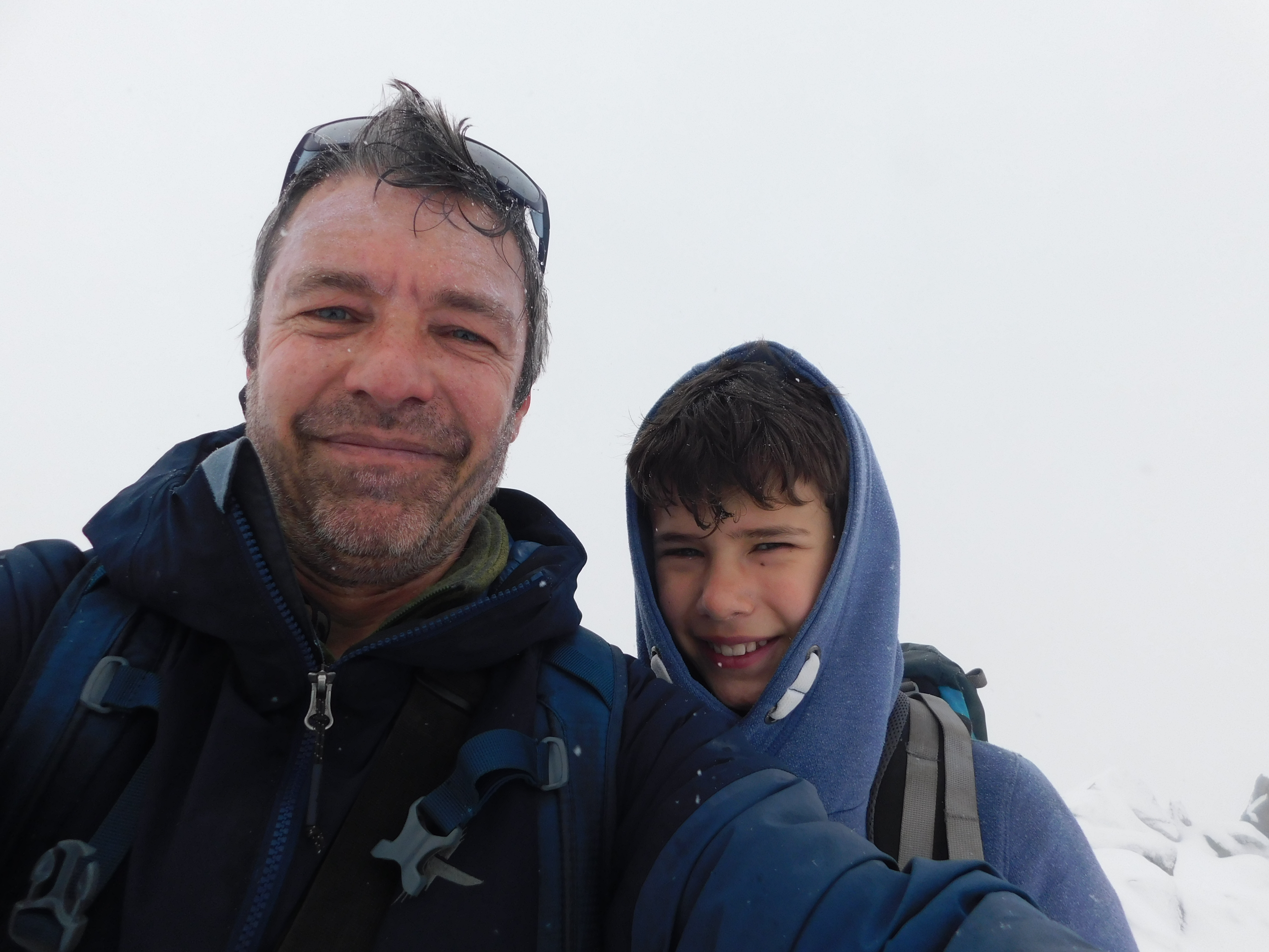 Partimos pensando que, de acuerdo al pronóstico del tiempo, el día se iba a despejar e iba a salir el sol. Nos encontramos con nieve a partir de los 1500m y nos nevó casi todo el día. Para encontrar la cumbre tuvimos que navegar con GPS y nos hundimos en la nieve hasta la rodilla. Recién al final de la bajada paró de nevar y pudimos ver algo.