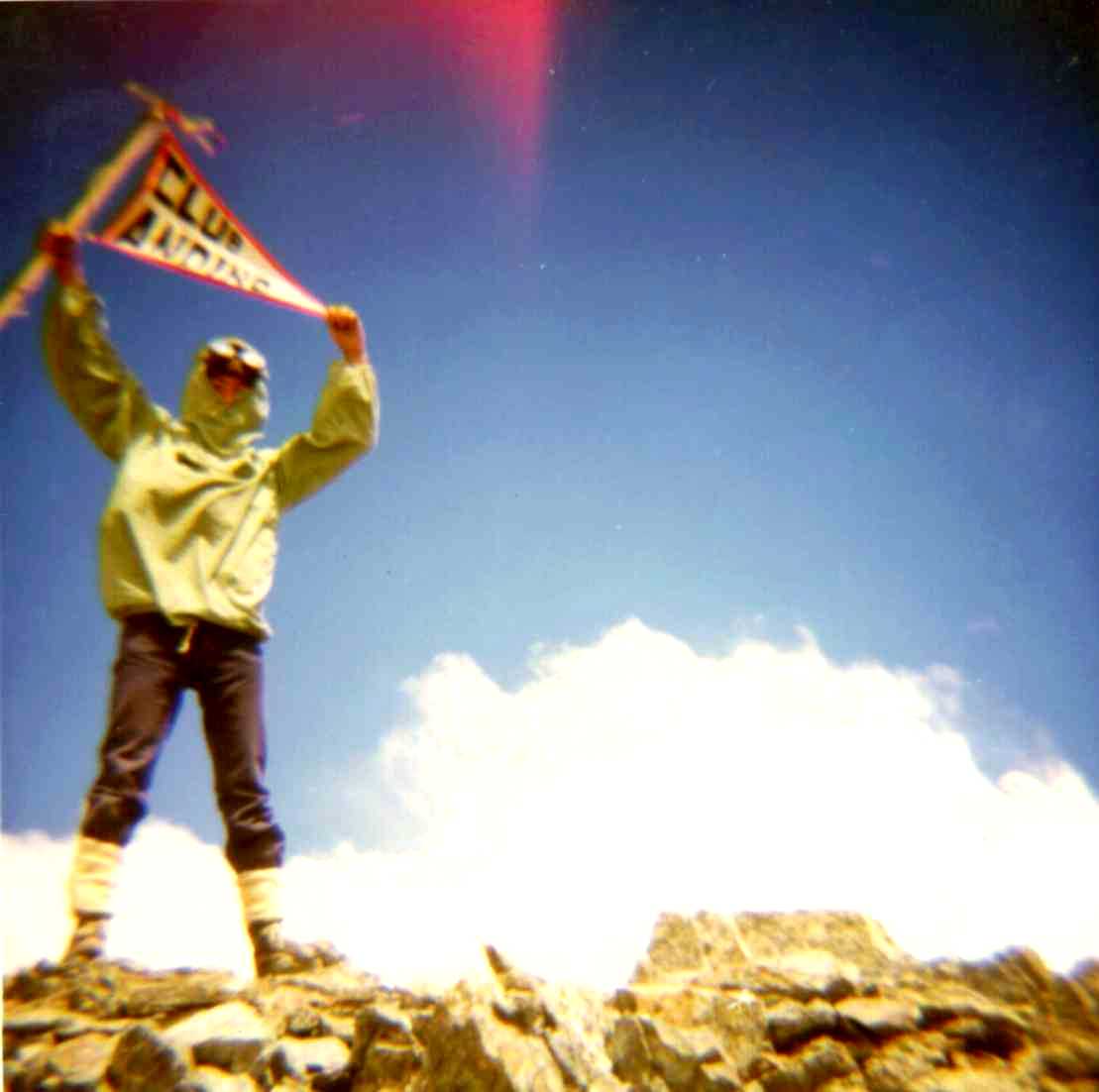 Franco Rodríguez en la cumbre de la Torre de Flores (verano de 1974), izando un banderín echizo de casa, especialmente para ese momento, en la frente se puede observar los lentes para soldar "oxiacetileno". El corta viento de tela popelina muy delgada, so Gratos recuerdos de aquella ascención, Julio Vergara nos invitó en aquella ocasión a mi y a mi amigo Arcadio Faune (hoy en día, aún grandes amigos). Precarios atuendos nuestros nos acompañaron en aquella travesía, el calzado era " american shoes ", que eran los zapatos de seguridad con punta de acero que utilizaban los mineros de Braden Cooper Company, nuestras gafas eran los anteojos para soldar "oxiacetileno". Bueno y así iniciamos nuestros primeros pasos en el montañismo de altura, observen la foto de cumbre, que dias aquellos, muy jovenes aún.