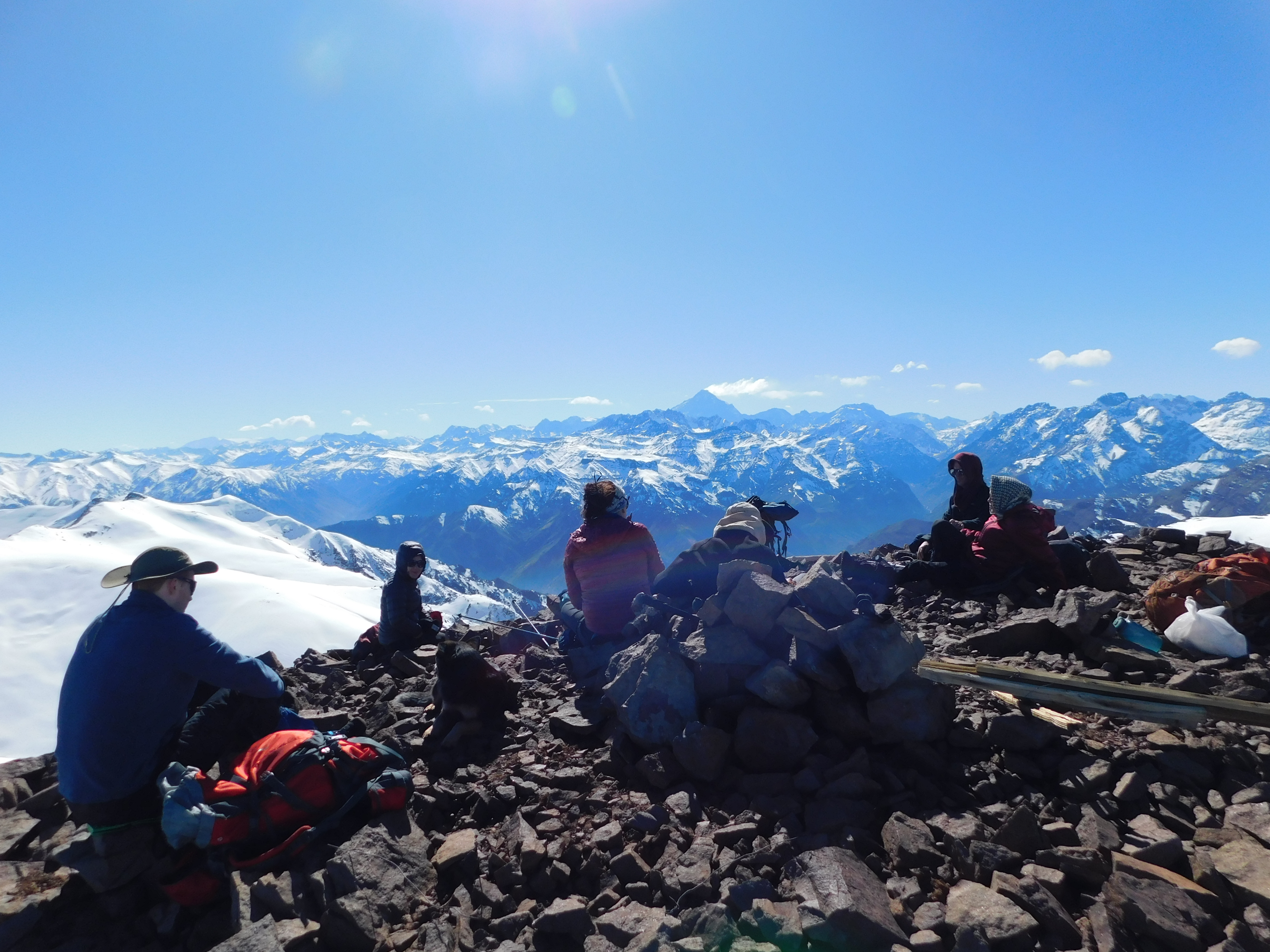 Grupo del DAV Santiago. A pesar de algunas dificultades al partir y de un pronóstico del tiempo poco auspicioso, conseguimos esta cumbre sin mayores problemas. En la cumbre el GPS marcó más de 3500m.