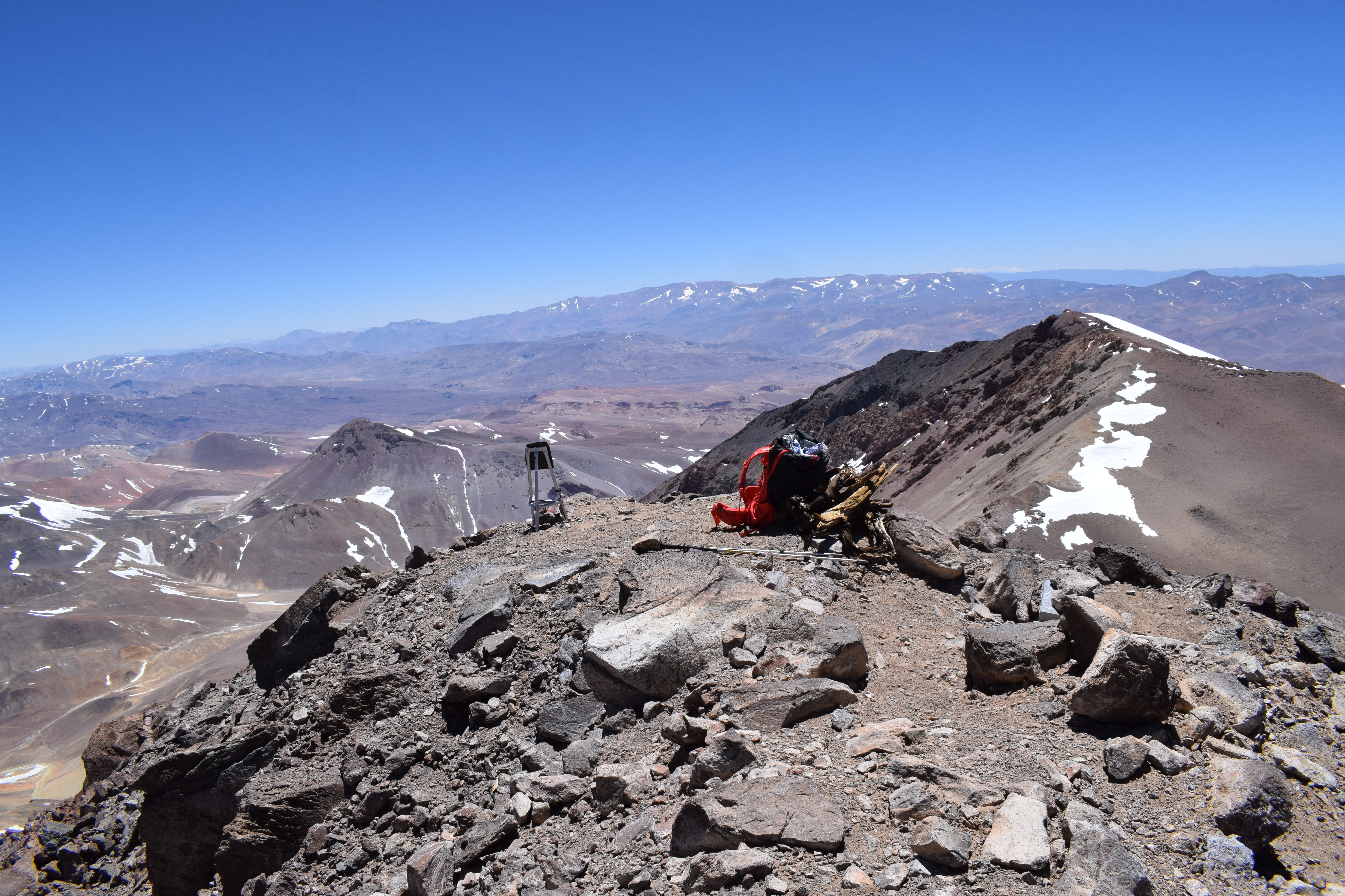Un cerro bastante hermoso por sus coloridas laderas y escarpada cara oeste, el campamento base en Escarchales ofrece postales de lujo, y el refugio Gabrial Mistral una comodida que se agradece a esa altitud. Agradecido de mi Cordada Leo González que me apañó en esta salida y que me esperó en el Refugio mientras ascendía rapidamente a la cumbre. Un viento y frío intensos me obligaron a estar solo 15 minutos en la cumbre, sin embargo, bastó para contemplar la maravillosa vista que ofrece, y ver además el glaciar que cae por el suroeste. PD: en la Aproximación aprovechamos de ascender el cerro Las Tortolitas que ofrece una bonita panorámica de la zona.