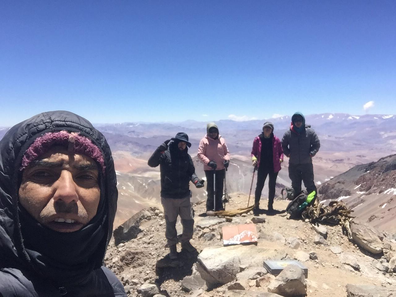 Todo esfuerzo tiene un sacrificio Mayo día 13 año 2023 Mi primer 6 mil. Este gran viaje lo iniciamos 4 días antes de hacer cumbre, no prepararme físicamente fue una de las causas de agotamiento, primer día en termas las hediondas camp 1, día 2 día sector escarchales tomamos nuestras mochilas porteando agua y alimentos desplazamientos al refugio Gabriela Mistral se hizo bastante duro el trayecto al llegar al refugio sobre los 5.200 no dormí casi nada vomité lo que comí en la noche, solo me hidrate en la mañana antes de salir, mis ganas eran infinitas pero en la noche dudé en mi mal estado (puna), mi compañero presentó los mismos síntomas. Eran las 8:45 en el refugio Gabriela Mistral y teníamos miedo de comer y vomitarlo, solo nos hidratamos bastante y salimos a las 10 de la mañana a tomar la cara norte