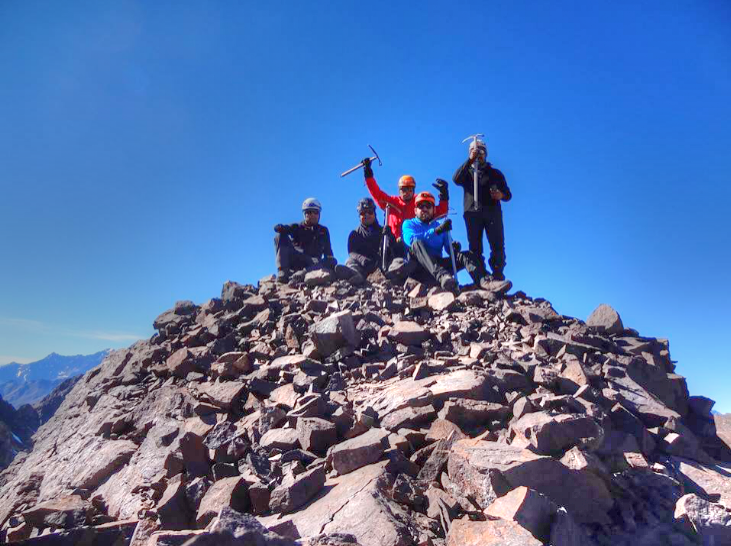 Como sugerencia, quedar lo más arriba posible del campo base, cuidando de no quedar expuestos a caída de rocas. Habíamos intentado anteriormente a comienzos de primavera. Pero la nieve acumulada hace más difícil el ascenso sin un piolet técnico. En esta ocasión aun había nieve que nos permitía zigzaguear y ganar altura fácilmente. En algunos momentos tuvimos que trepar más de algunas rocas para evitar el subir por el acarreo que está más a la izquierda del portezuelo entre el central y el sur. Bonita experiencia, buen grupo y un muy buen día para hacer cumbre. Dedicado a nuestras familias y amigos! CLUB DE MONTAÑA DE SANTA MARIA (Mauricio Lazo, Fabián Gallardo, Diego Arancibia, Sergio Torrejón, Ariel Saá *Paz Cañete, *Igor Armijo).