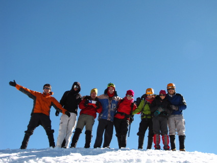 Parte del grupo. Diciembre de 2009 Salida de aclimatación del Club Andino Universitario (CAU) para el volcán San José. 5 horas desde el Campamento a los pies del estero Monos de Agua. Condiciones de ascenso excelentes y martavillosa vista desde la cumbre.