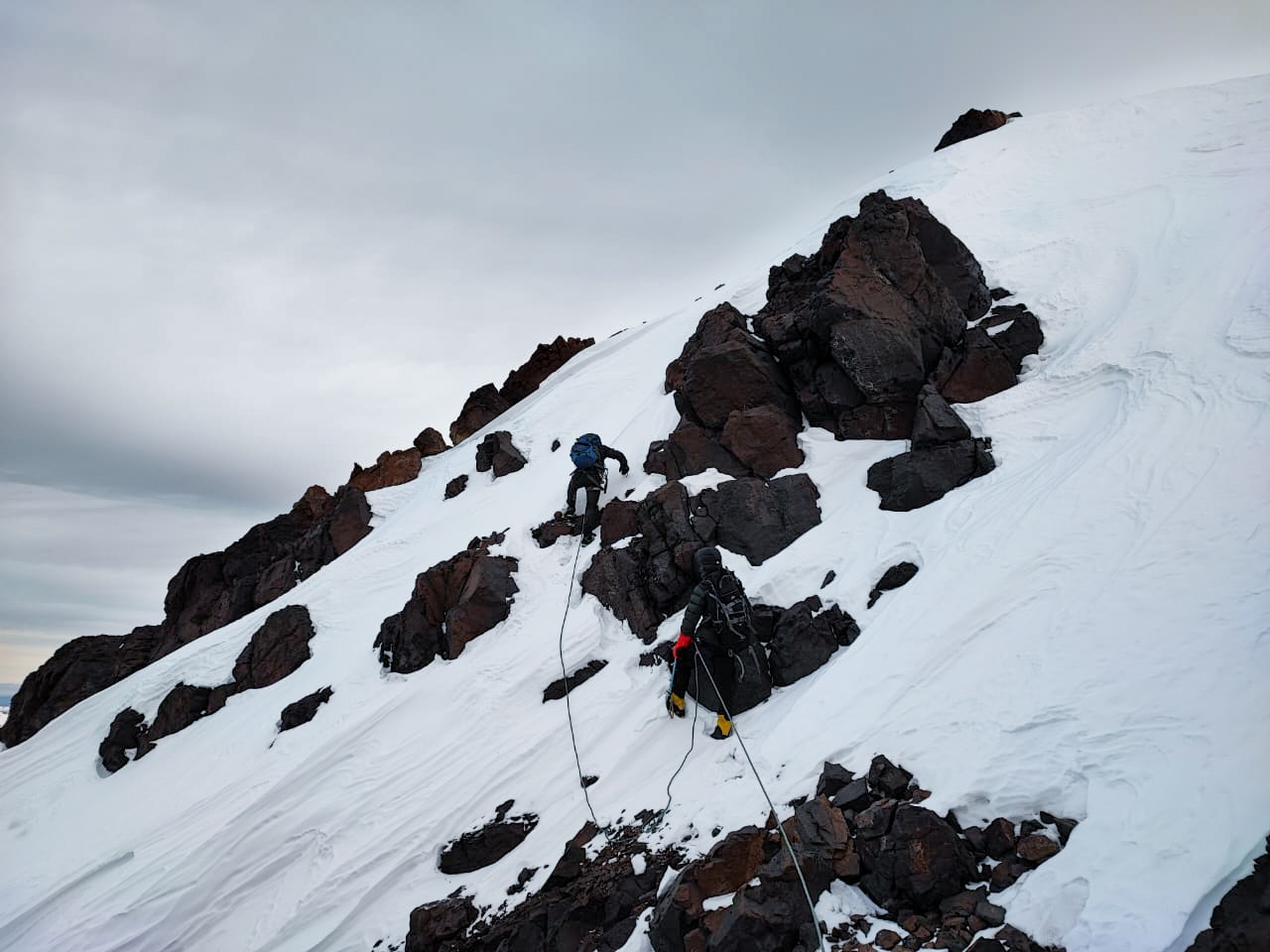 Fuimos antes de que empezara el mal clima, aún así, no dormimos en toda la noche por el viento, y subimos con ráfagas de hasta 50-60km/hora lo que nos obligó a encordarnos. La cantidad de nieve que había permitió no utilizar ni un rapel, escalamos y desescalamos las paredes de nieve y roca.