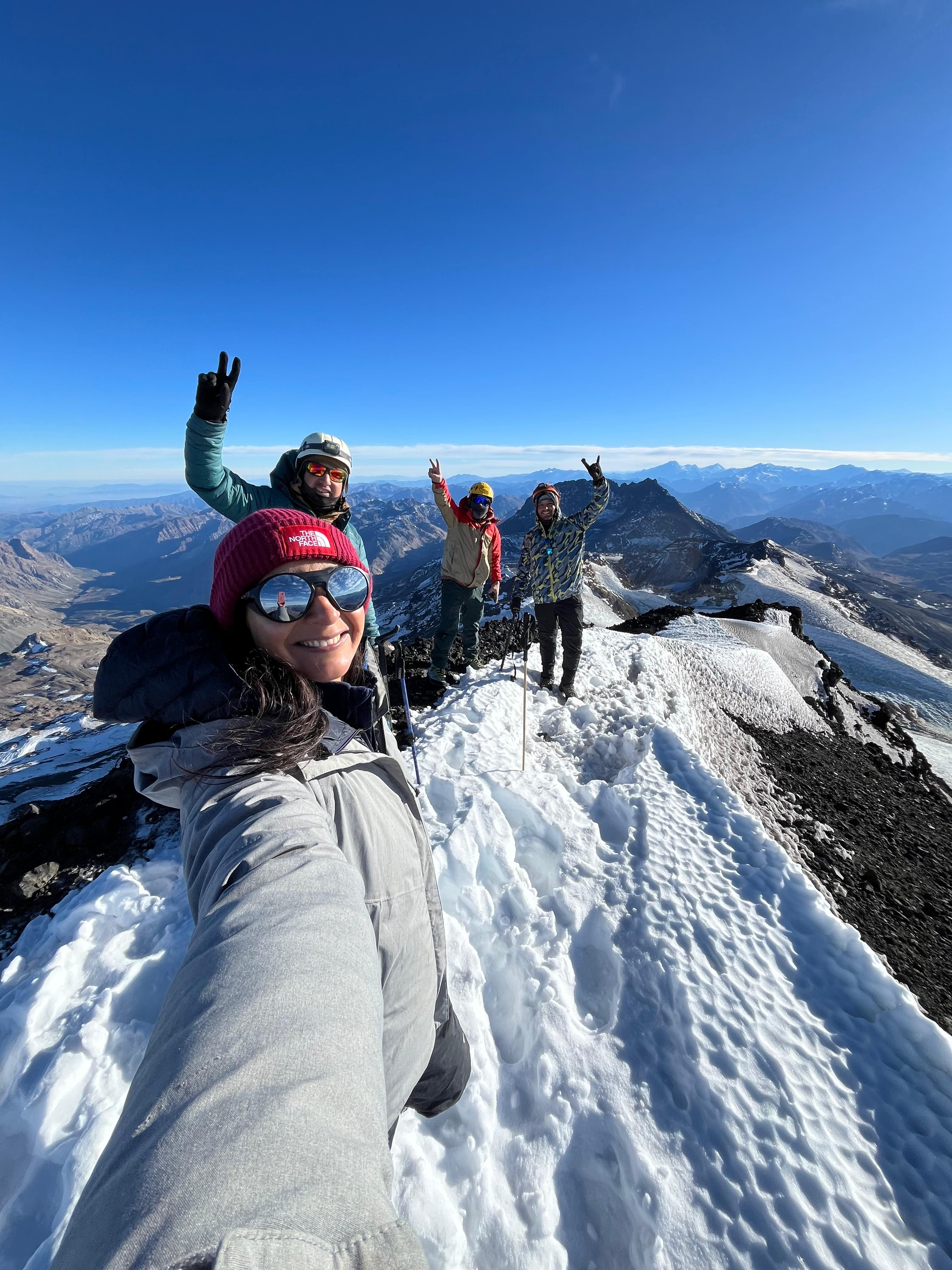 Dura jornada de 13 horas desde el vivac que armamos a 2900 msnm un poco más arriba partiendo desde gendarmeria, muchos penitentes, crux de la ruta bien expuesto con roca suelta pero se logró junto a Aníbal Moreno Torrejón Llegamos por el paso pehuenche, ruta hacia gendarmería en muy mal estado, con muchos cruces de ríos pero no imposible en 4x4 y con mucho cuidado. Aún vialidad no está arreglando la ruta pero los chicos de azufre snow resort tienen máquinas con las que arreglaron la parte más crítica y tienen mucha disposición a ayudar a los turistas para poder pasar. La ruta bastante clara pero con muchos penitentes y acarreos que consideramos más que física un ruta mental. Recomendamos la Ascención vía baños del azufre que es más directa y aún tiene mucha nieve para montarse con crampones desde bien abajo y dormir en las termas. Abrazo de cumbre
