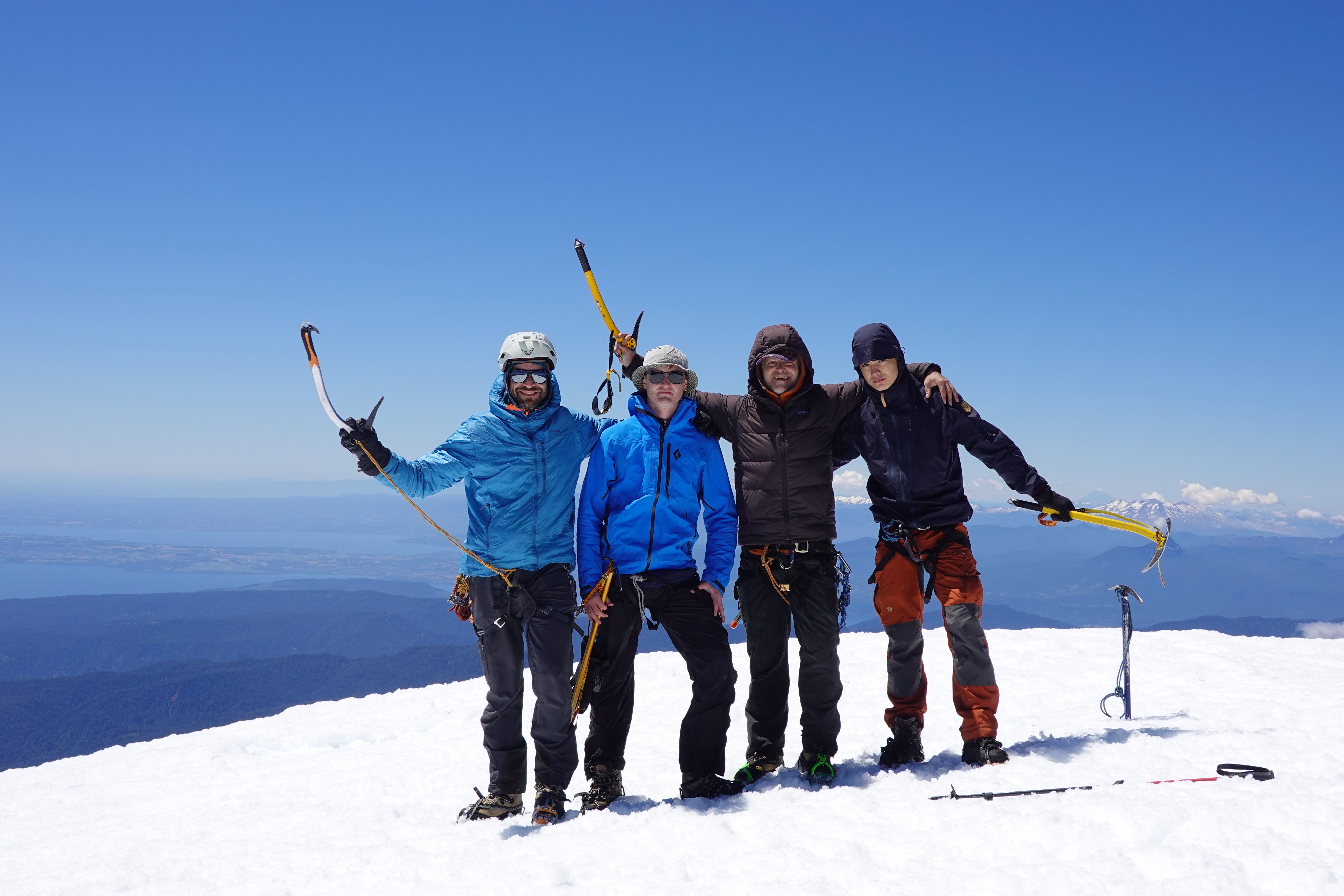 Tomás De Iruarrizaga, Juan Cox, Paulo Cox y Dante Cox, en la cumbre del Osorno. Día completamente despejado durante toda la jornada. Partimos alrededor de las 5AM desde Puerto Varas e iniciamos el ascenso a las 7.45 aprox. Ascendimos una variante directa de la ruta por La Picada. Algo de viento sur en el último segmento de la ruta y en la cumbre (20km/h aprox.). La nieve se encuentra bajo los 2000m aprox. Buenas condiciones de nieve para crampones. Nos pusimos los crampones apenas alcanzamos la nieve y desde ahí hasta la cumbre, y de vuelta, no nos sacamos los crampones. Las condiciones de la nieve permiten un ascenso con randonée, aunque sugerimos llevar crampones para los esquíes, porque en la parte alta de la ruta hay nieve ahielada o hielo bajo una capa de nieve blanda de unos 15cm a 20cm aprox. Último tercio de la sección de nieve con pendiente sost