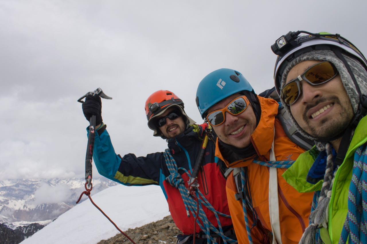 Un buen ascenso con un tiempo perfecto, sol a veces y frio también. Llegando a cumbre empezo a plumilar, comenzando una nevada hasta las 9 pm, cuando llegamos al auto en el valle de Las Arenas. Nuestra idea original era ascender la Pardo-Peña. Finalmente salimos muy tarde a cumbre, no pudiendo ver la tarde anterior el estado de la ruta por una tormenta que tapó el valle. Decidimos asegurar la ruta de bajada subiendo por ella misma, lo que fue providencial porque existian muchos pasos irregulares donde cruzar el mar de grietas y seracs, los que finalmente luego de cumbre descendimos entre tormenta. No usamos ningún tornillo pero sí estacas para asegurar los pasos claves.