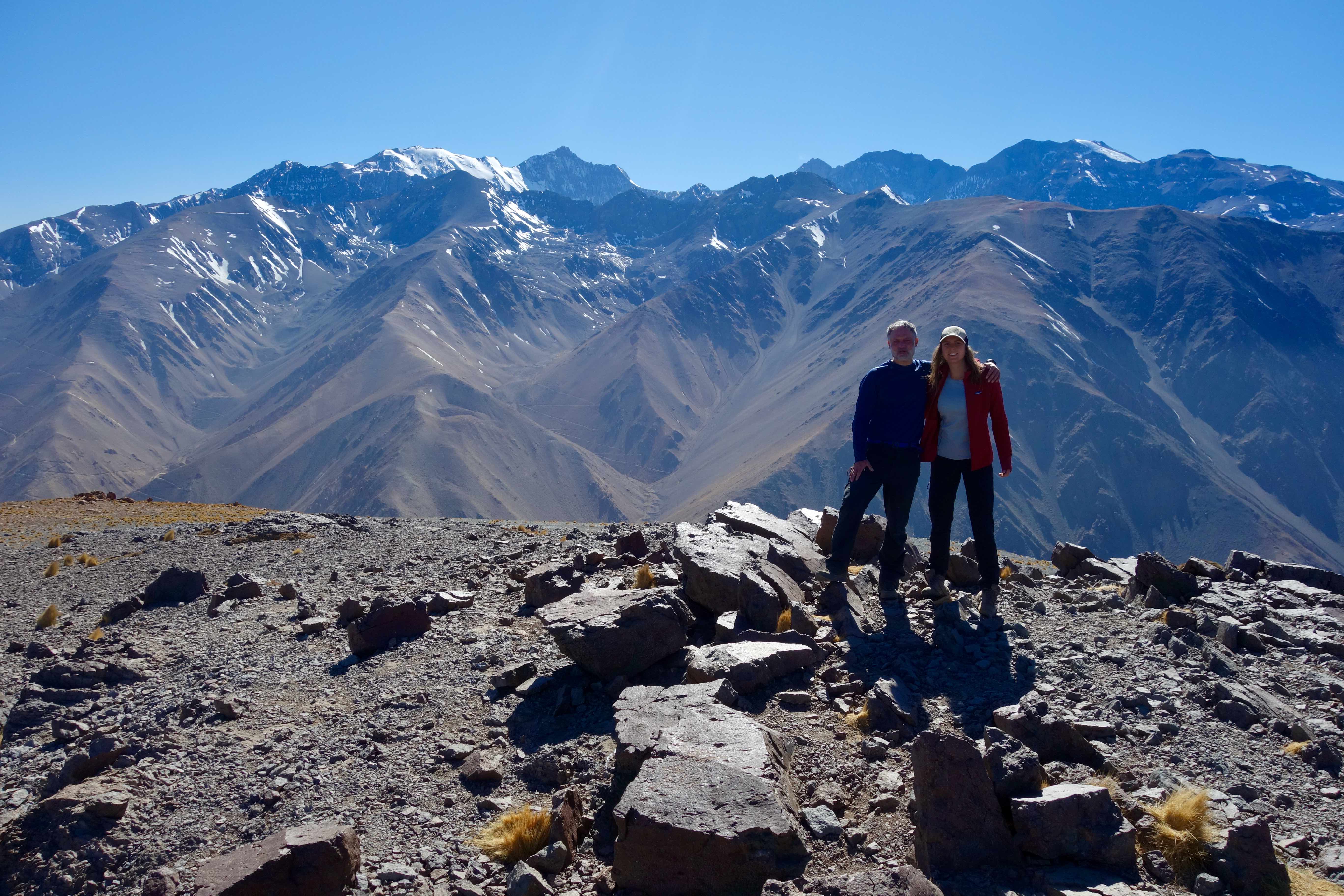 Los primos con el Altar, Paloma y Plomo de fondo. Cordada de primos Cox: la Francisca y Paulo. Salida temprano (partimos subiendo a las 7AM), lo que permitió subir hasta el filo sin sol. Más tarde hizo bastante calor. Despejado y sin viento. Tiempo de subida: 2h 20mins.