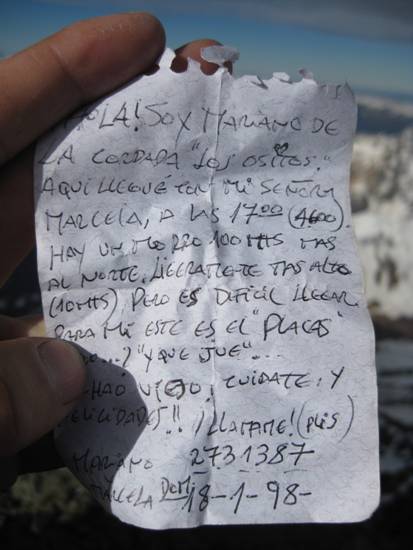 Testimonio encontrado en la Cumbre Sur del Co. Placas