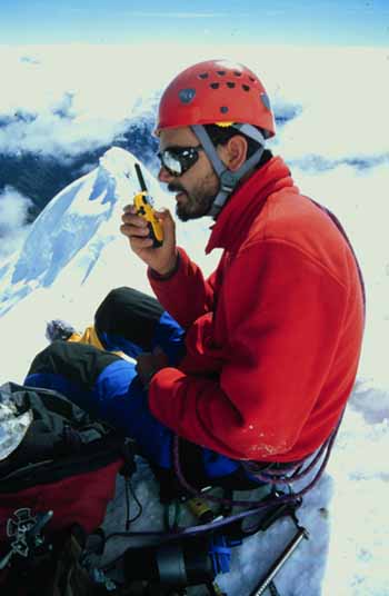 Kato comunicándose con Ian Philippi en el campamento base Ascensión con buen tiempo y buenas condiciones de terreno.
