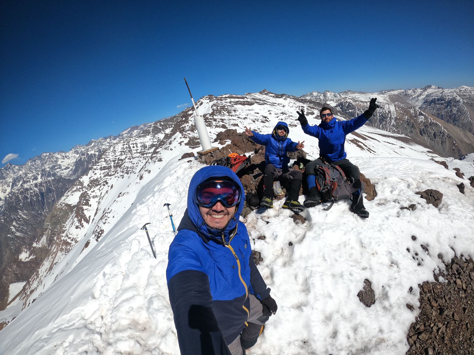Cumbre por vía normal. Asenso luego de las últimas nevadas de septiembre, bastante nieve, hasta la cintura en algunos puntos. Excelente día y buenas condiciones de tiempo, mucho viento en las partes altas. 5 horas y media desde CB a Cumbre, 2 hrs de bajada.