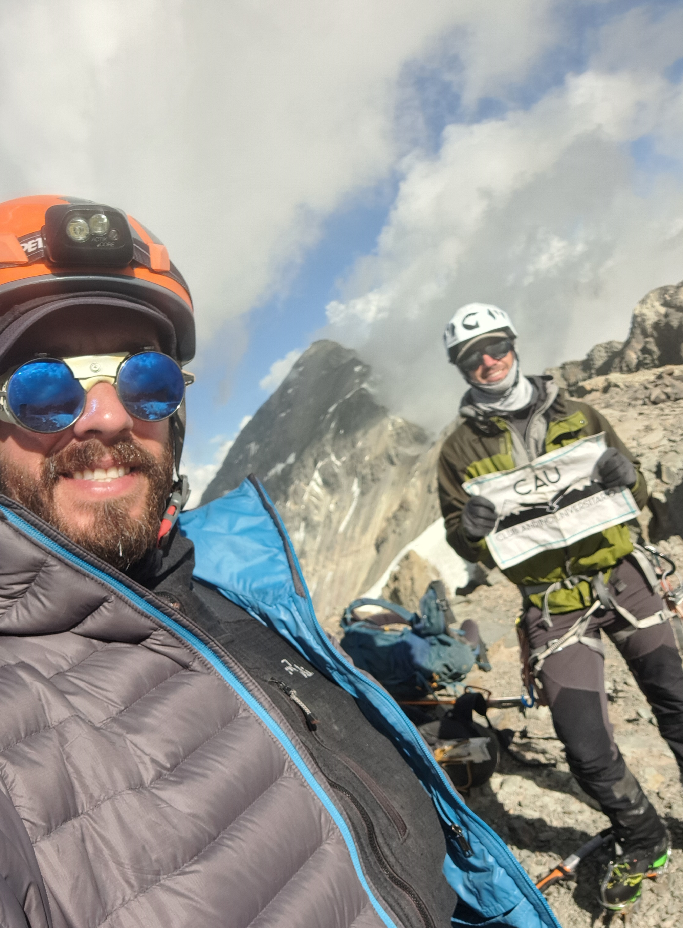 Foto de cumbre en el Cerro la Paloma despúes de ascender por el Glaciar Sur Larga jornada de 24 horas que se hizo insufrible por los penitentes. Ruta muy cambiada en que lo mejor fue la escalada en hielo por el glaciar sur. El track para bajar por la ruta normal fue salvador ya que nos alcanzó la noche.