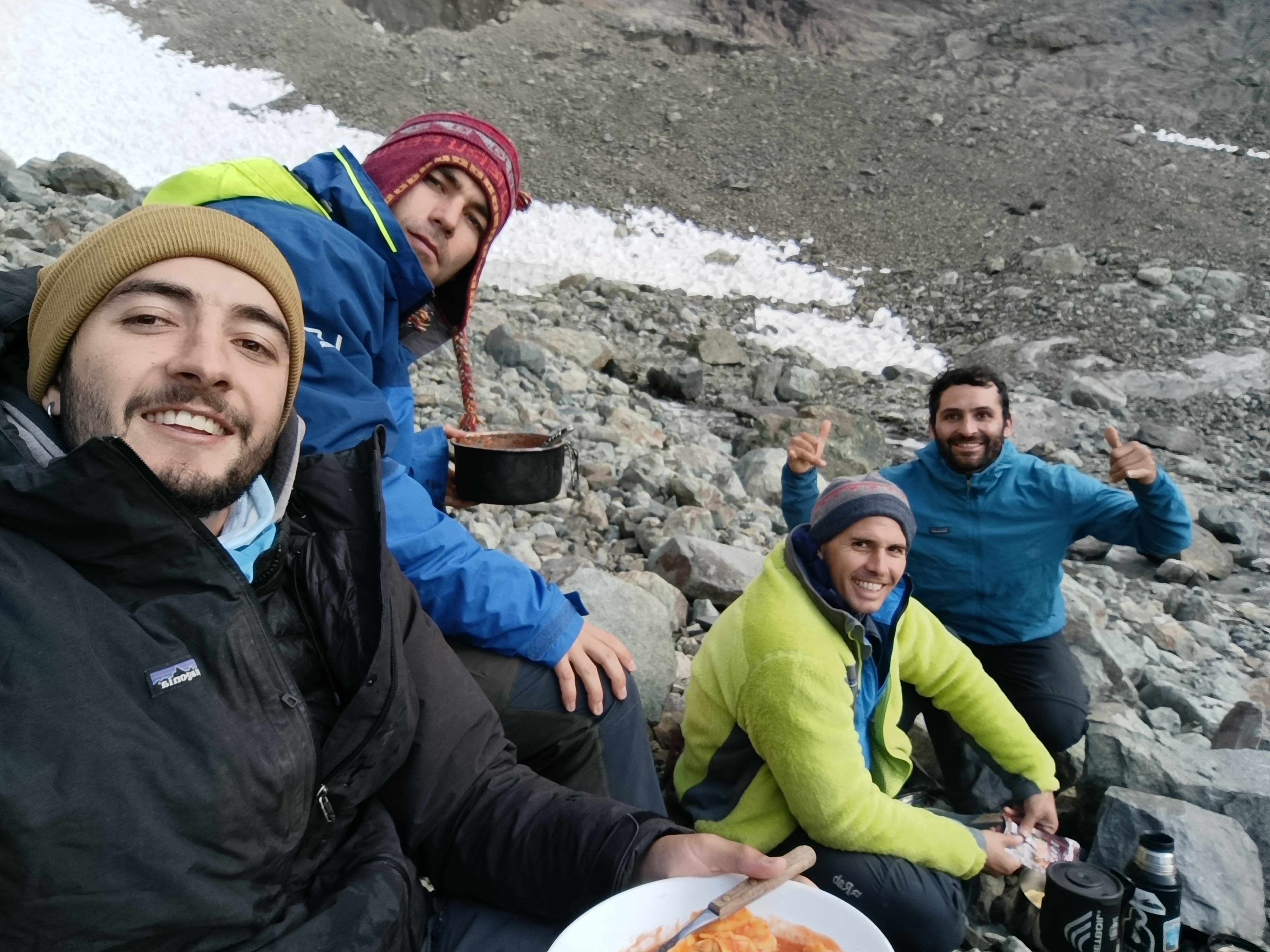 Larga jornada de 8 hrs desde Piedra Carvajal. Había muy poca nieve y los tramos con glaciar fue factible sortearlos con éxito, por lo que no fue necesario el uso de piolet ni crampomes. El acarreo es la tónica del ascenso, lo que hizo la ruta excesivamente agotadora. Cordada: Shannen Daniels, Raimundo Novoa, Loreto Fontaine, Rodrigo Pérez, Diego Montero.