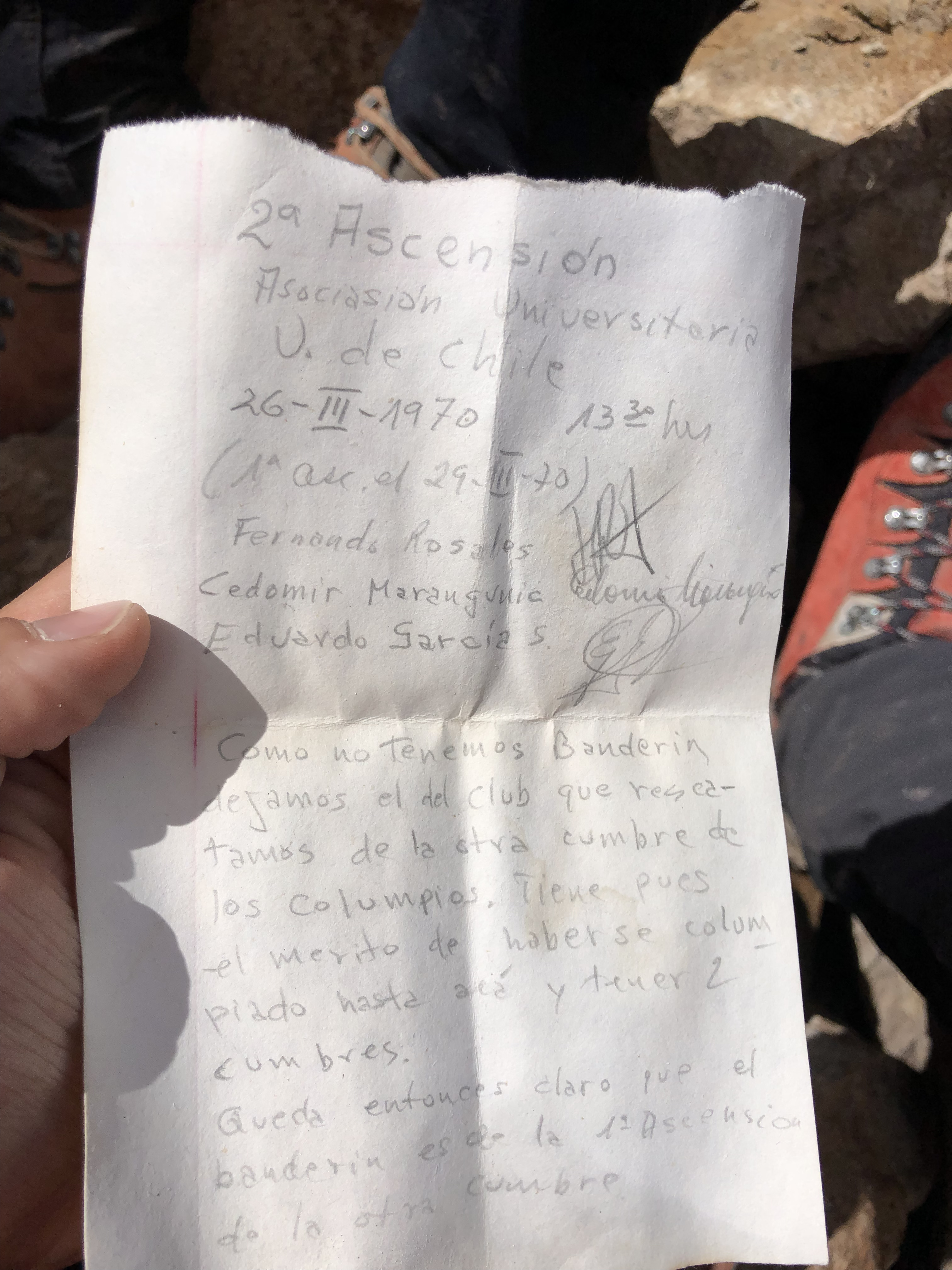 testimonio del 2do ascenso encontrado durante la expedición de los leones de montaña