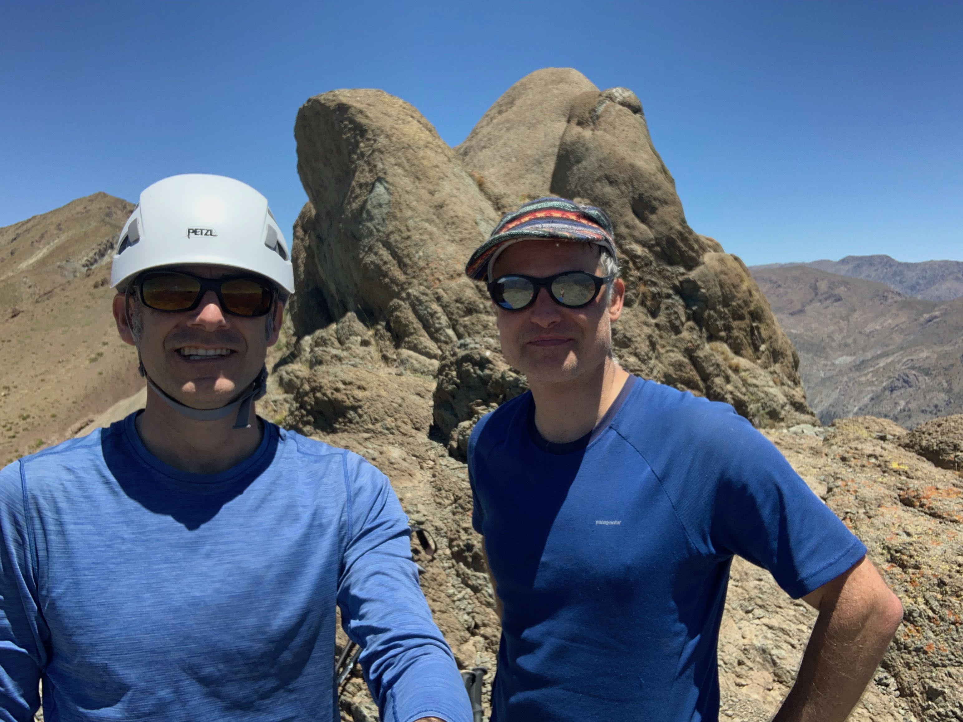 En la cumbre del Horizonte. Atrás las puntas de los rocones de la cumbre, en las que un momento antes se había posado un cóndor. Día esplendoroso para la contemplación de la alta cordillera desde el Punta Horizonte. Este es un punto ideal para la vista del Mesón Alto completo y la tríada del Plomo (Altar y Paloma), desde un ángulo muy poco conocido. Ninguna nube, muy poco viento, y bastante fresco sobre el filo. No vimos otros ascensionistas durante la excursión.