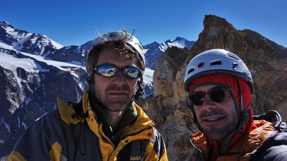 Aclaramos un par de misterios sobre el cerro aunque no todos. La canaleta por la cual se sube es la de la izquierda (Noreste). La cumbre es la cumbre y la otra punta debe ser un poco más baja. Antes que nosotros subió un grupo del Monval y unos desconocidos que dejaron un testimonio ilegible por lo que seguimos sin saber quien hizo el primer ascenso o dejó ese testimonio. Marcelo y Felipe subieron por la otra canaleta que no conecta con la cumbre. La foto de cumbre la sacamos en el portezuelo más abajo porque la cumbre se está desarmando. Entre acarreos, penitentes y piedras cayendo por la canaleta, resultó ser una ruta dura.