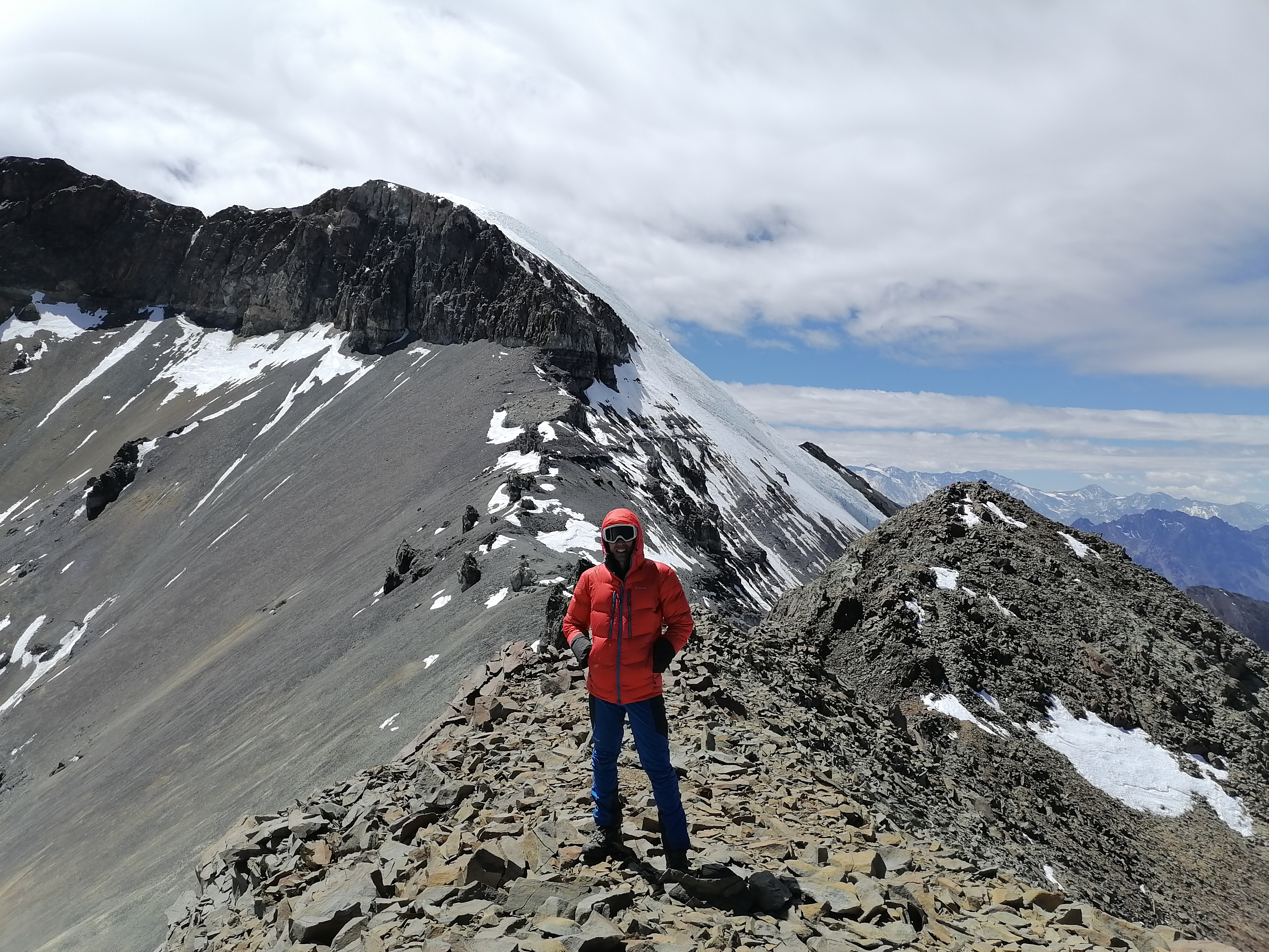 Maravillosa vista e imponente vista Cumbres de los Cerros "Punta Santiago" altitud 5083 m. seguimos el filo y el mismo día alcanzamos las cumbres de "Punta Hermandad" altitud 4930 m. y "Leonera" altitud 4954 m. Bajamos por la cara este del Leonera, gran y entretenido acarreo. Increible y exigente travesía. Atacamos cumbres el Sábado 12 desde muy cerca del refugio Federación. Muy contentos de haber llevado a cabo algo que se planeo con detalle y se materializo con éxito. Gran cordada Esteban Silva