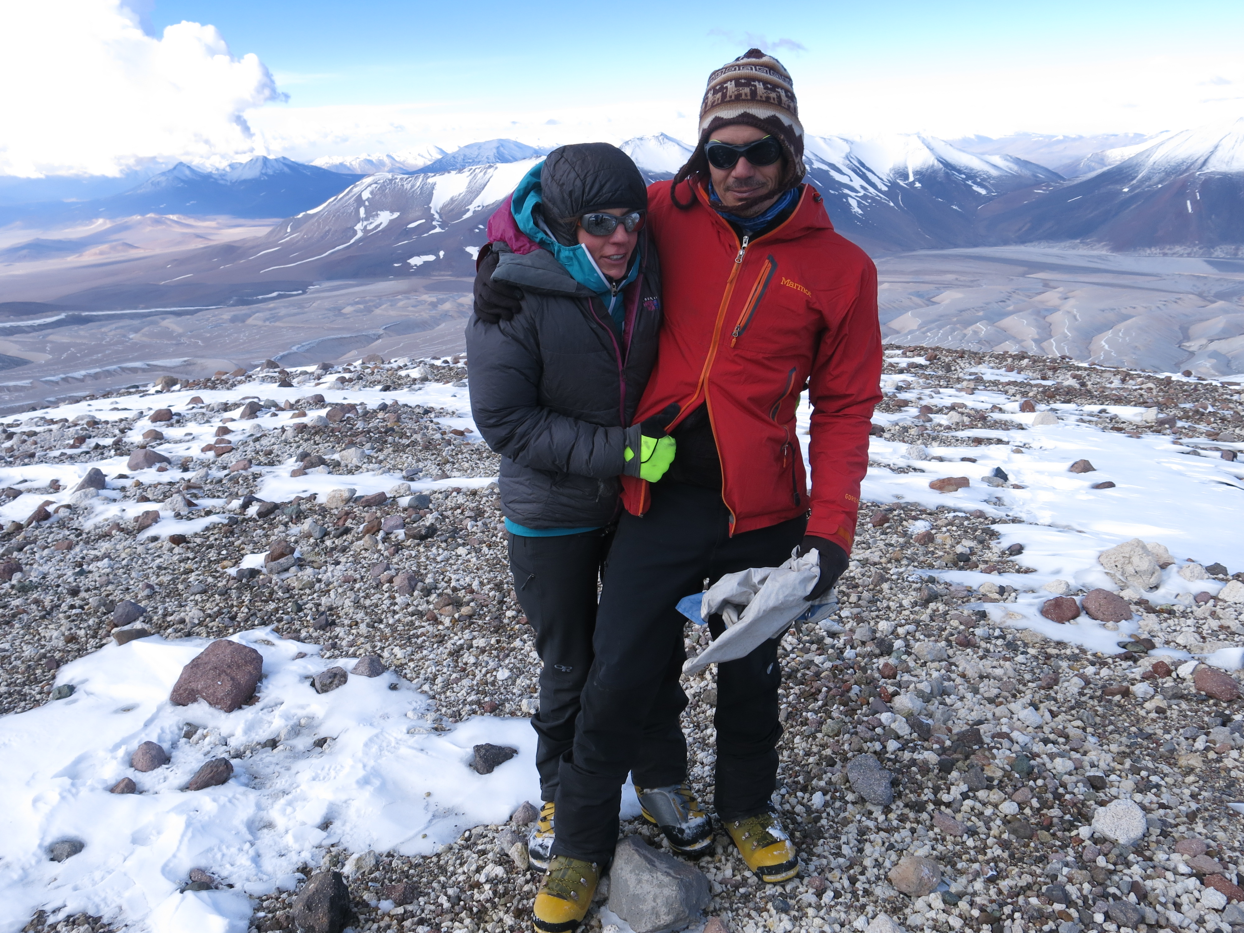 Frío día, pero felices en la cumbre. Larga caminata. Largo viaje. No es un camino simple para alcanzar la base, de hecho, quedamos a más de 10 kms de la base de éste. Hay quebradas, ríos, penitentes gigantes, etc. El cerro se sube rápido, pero hay que ser cuidadoso para encontrar el camino de regreso a los vehículos o campamento.