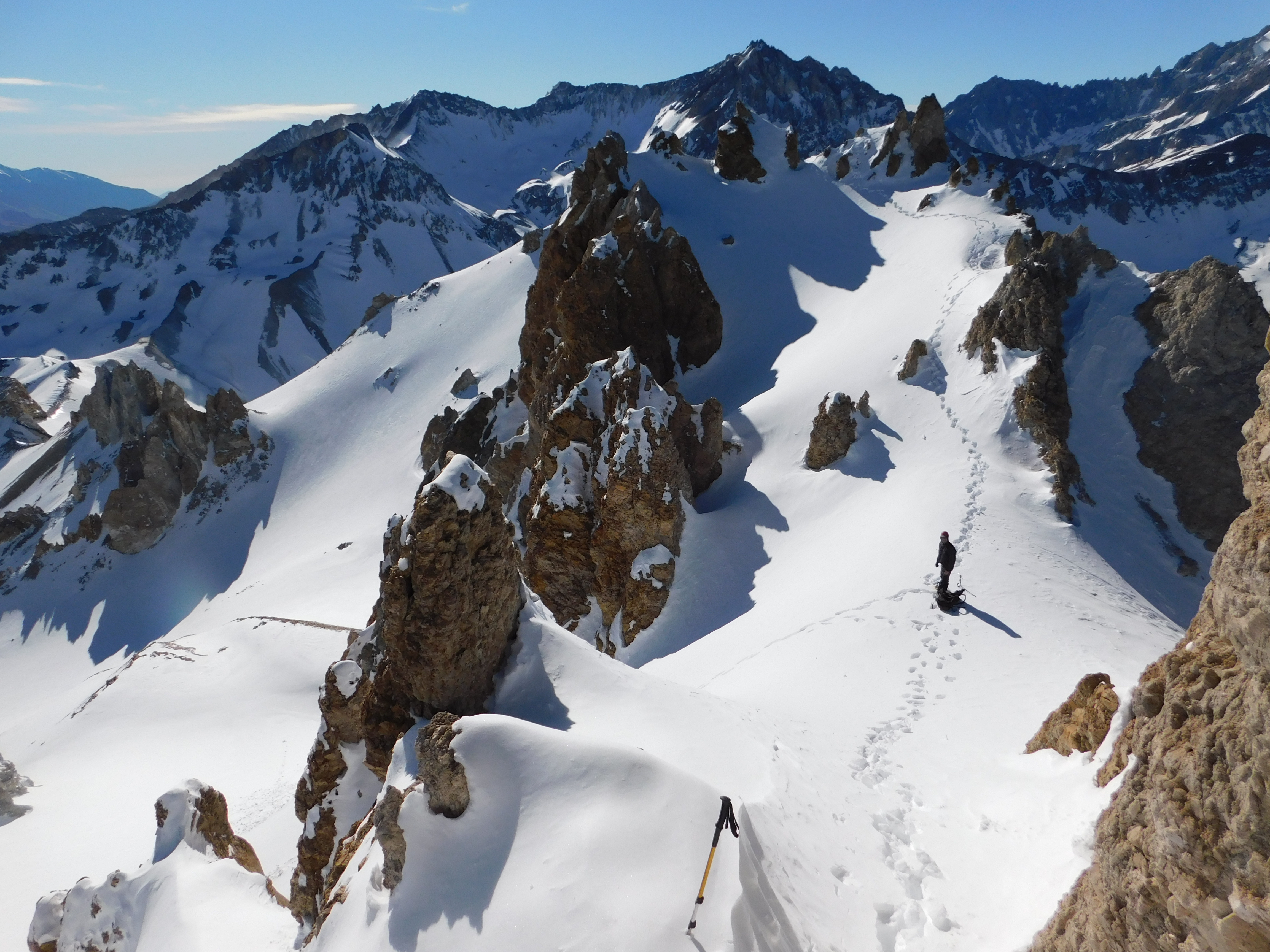 La foto la tomé sentado desde el torreón norte. Antes habíamos intentado el torreón sur, pero escalar la parte final tenía mucha exposición y roca descompuesta. Subimos por la ruta Alemana Nueva, y a la bajada, después de bajar el canalón Meichsner, bajamos por otra canaleta, y seguimos por el valle que lleva al Paso Nieves Negras al campamento, haciendo una especie de circuito. Hay una bajada mucho más directa, que creemos que fue la del primer ascenso.