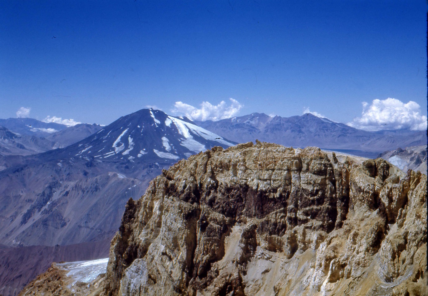 Por la misma ruta del día anterior llegamos al filo principal, donde tomamos a la izquierda. Hay muchos penitentes para atravesar hasta alcanzar la Cumbre Central de los Picos del Barros 5150m. También erigimos una pirca dejando un tarro con los documentos de la Primera Ascensión. La vista en todos los alrededores es espléndida. Pasamos por el Campamento II y bajamos al Campamento I.