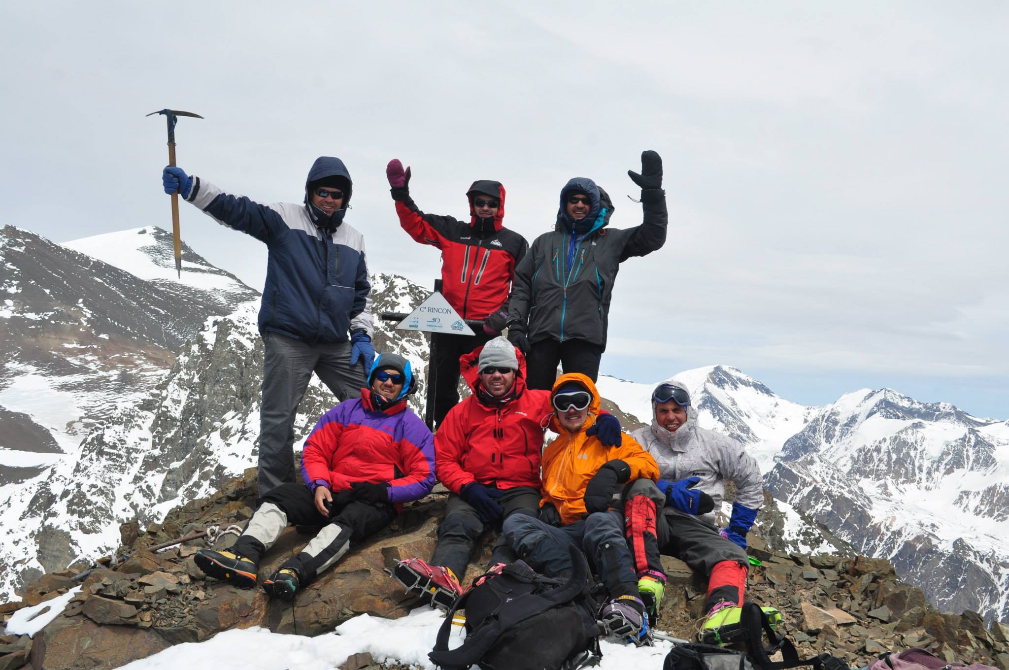 Abajo de izquierda a derecha: Lucas Dalessandro, Martin Romito, Fernando Gonzalez y Andres Saenz Caminamos desde las 03:40 por el glaciar inferior, ascendimos directamente hasta llegar al filo, de ahi al glaciar medio y subimos por la canaleta que vincula al glaciar superior, hicimos cumbre a las 12:40hs. Muy buen tiempo, despejado y poco viento.