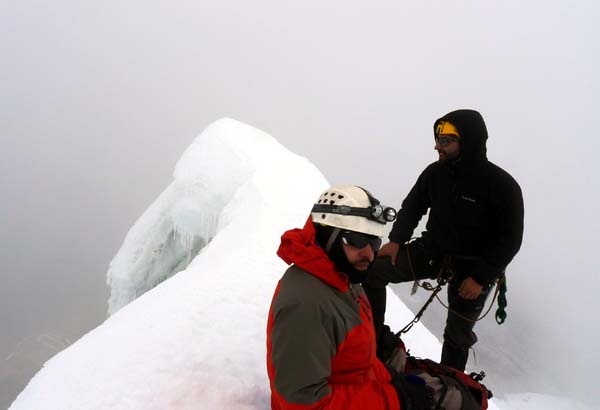 La expedición se gestiono en dos días en la primer semana de agosto. Clima estupendo en el ascenso. En el primer día se hizo aproximación a campamento base a la orilla de la laguna; el trekking toma unas 3 hrs aprox. Partimos el siguiente día por la madrugada 2am aprox para ataque a cumbre. Se llega a una pequeña pared de hielo sólido de unos 5mts. Se continúa con progresión en glaciar. Presencia de grietas transversales. Se continúa hasta llegar a una pared inclinada (50 a 60° en su parte final) de unos 150 mts. Empleamos 2 cuerdas de 70 mts y estacas de nieve. Terminada la escalada de esta pared se llega a cornisa de hielo en el filo de la montaña. Se continúa hacia la cumbre visible con una inclinación de unos 50 grados. En el descenso empleamos rapel. Tiempo aprox de ascenso 5 hrs. Descenso 3 hrs.