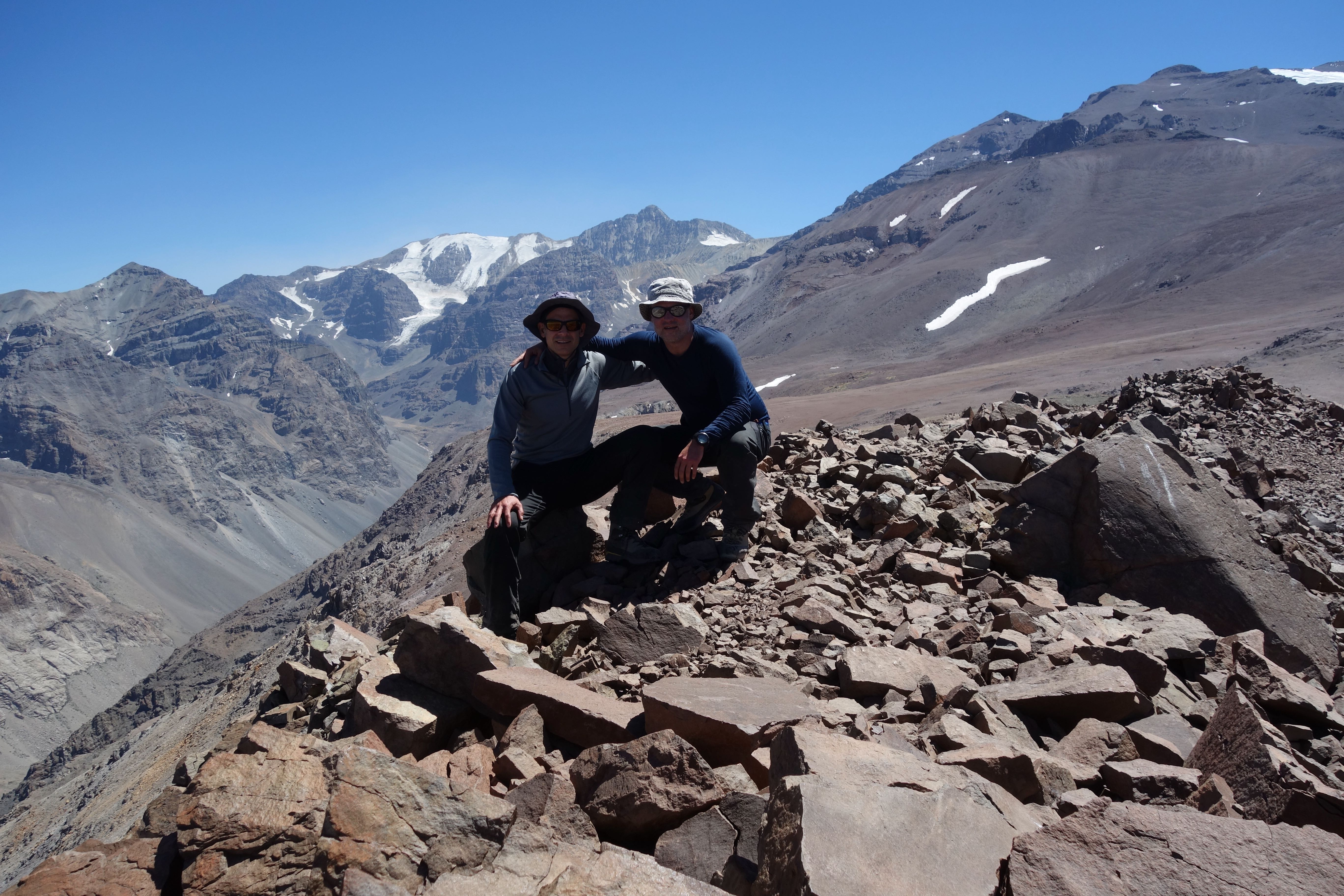 último día del año con una cumbre. en tercer plano la Paloma y el Altar. En segundo plano, a la derecha, el desmoronamiento de material que mantuvo cerrado por más de un año Yerba Loca. Linda cumbre. Día con buenas condiciones, sin mucho viento. Partimos de Santiago la noche anterior y caminamos con luna hasta donde hay 6 pircas de origen desconocido, junto a una vega. Al día siguiente demoramos 2 horas y 10 minutos a la cumbre desde el lugar donde vivaqueamos. Avistamos numerosos cóndores al descenso.