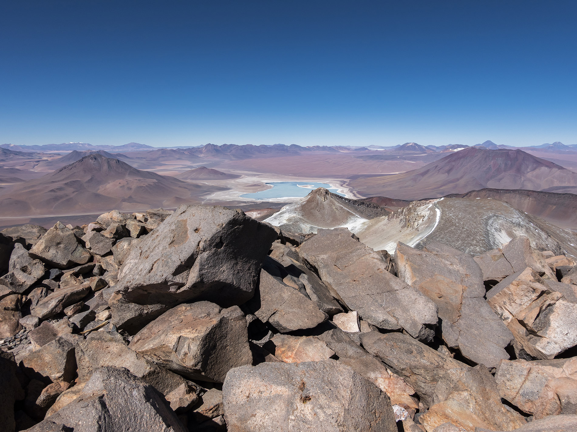 Cumbre Sairecabur con vista hacia el SE apreciándose la Laguna Verde. Es un Volcán engañador. El hecho de ganar altura rápido puede inducir a la tentación de que resulta fácil. La altura se siente y el progreso, entre acarreos y rocas grandes, requiere atención. La falsa cumbre requiere paciencia, toda vez que superado ese tramo, viene una pérdida de altura (trinchera) para luego recorrer los metros finales a cumbre. Hermosa experiencia, bella vista, respetable Volcán.