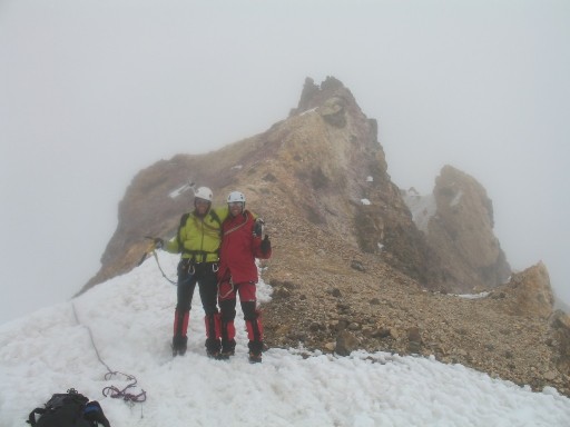 El último tramo antes del paso de roca que permite montarse en la cumbre se encontraba con hielo podrido, por lo que se protegió para ser ascendido. El punto más alto de la cumbre argentina es el que queda más al fondo (norte) y fue necesario rodear por abajo (este) el filo que conduce a la cumbre. Dada la fecha y el estado del cerro, fue necesario hacer una pequeña escalada en roca descompuesta de muy mala calidad.