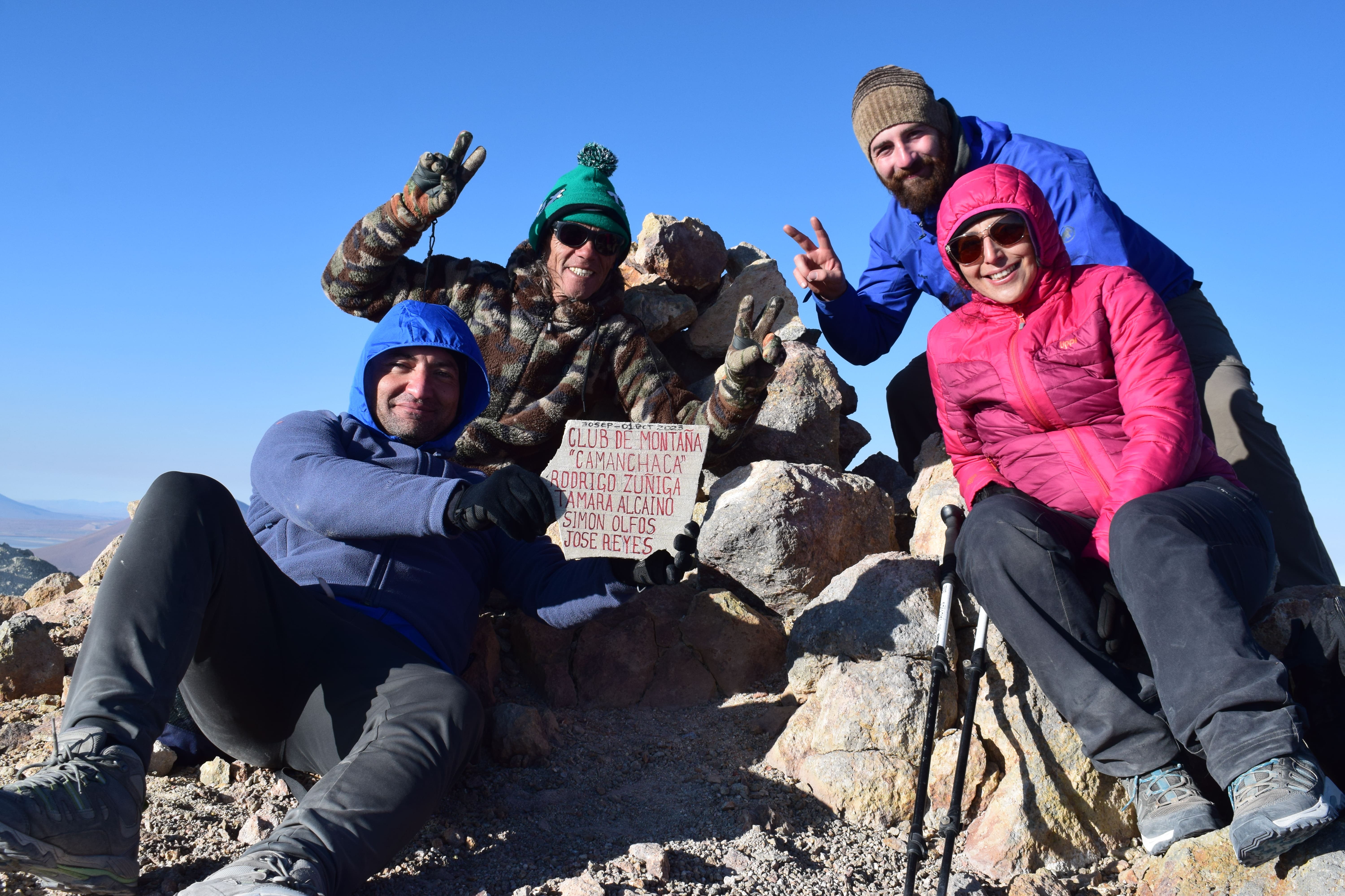 Comenzando jornada 3:40am, poco viento, bastante frío sobre los 4800m. En total 4 horas de ascenso, un poco más de 1 hora de bajada. José Reyes, Tamara Alcaino, Rodrigo Zúñiga y Simón Olfos.