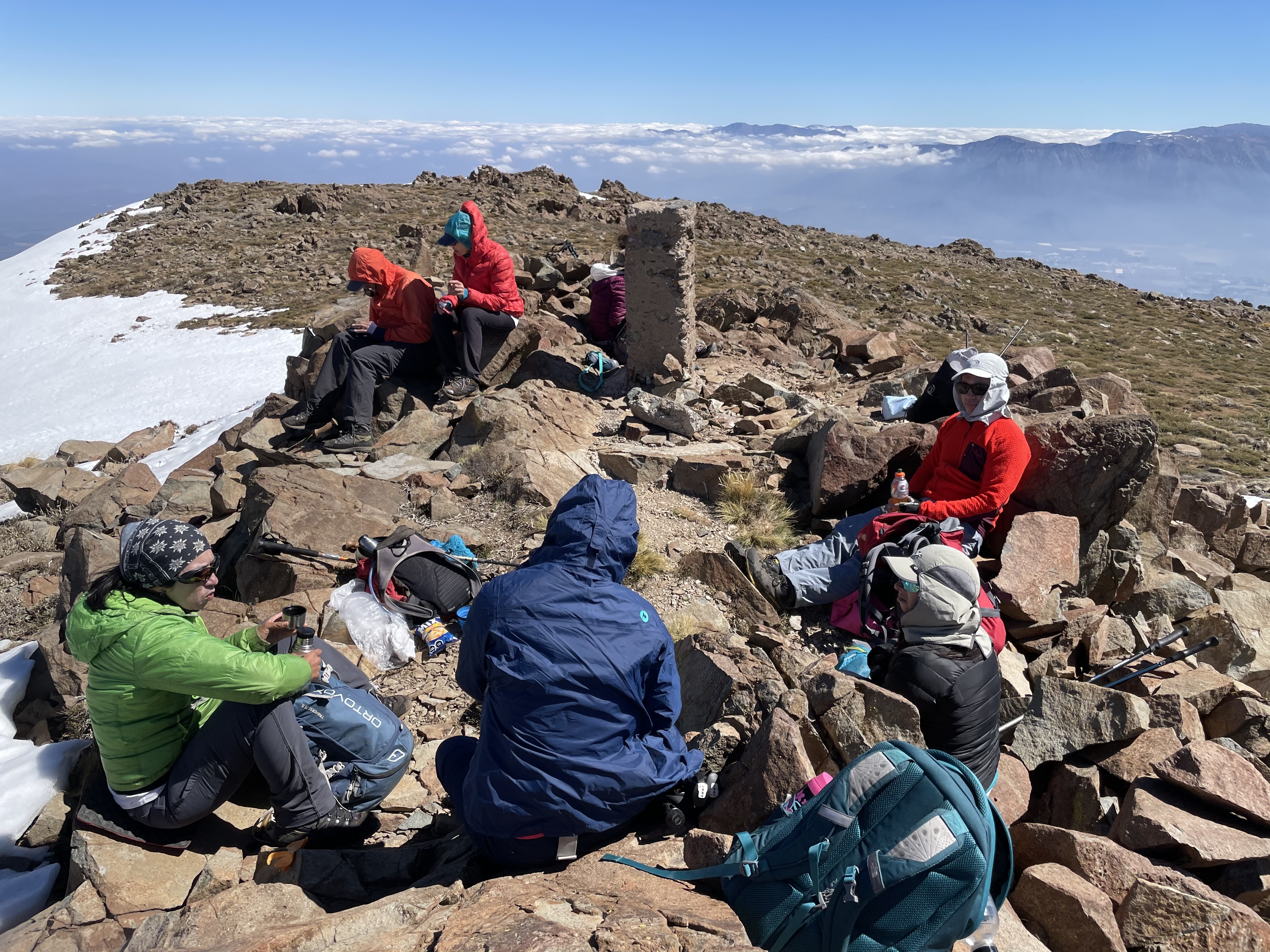 Pedimos permiso a personas de la comunidad para que nos abrieran el portón de acceso. (Esto es porque desde hace un tiempo que no está permitido el acceso por el sector de las Cornisas). Avanzamos en auto casi 1,6 km después de la cadena por lo que finalmente, fueron casi 19 km en total lo recorrido y 1700 de desnivel. Al principio nos tocó nubosidad baja, en casi todo el sector de bosque, llegando a la “Mesa” ya pasamos el límite de las nubes y en el portezuelo donde hay una imagen de San Francisco de Asís, podíamos ver el pueblo de la Punta. En el filo cumbrero, habían planchones de nieve y corría algo de viento lo que nos hizo abrigarnos. Descansamos en la cumbre disfrutando las vistas. El cerro estaba bastante limpio, la explicación al parecer es que ya no se permite el acceso a todos esa zona, las personas de la comunidad nos explicaban que habían tomado esas medidas por los robos, incendios y basura que dejaban algunos visitantes.