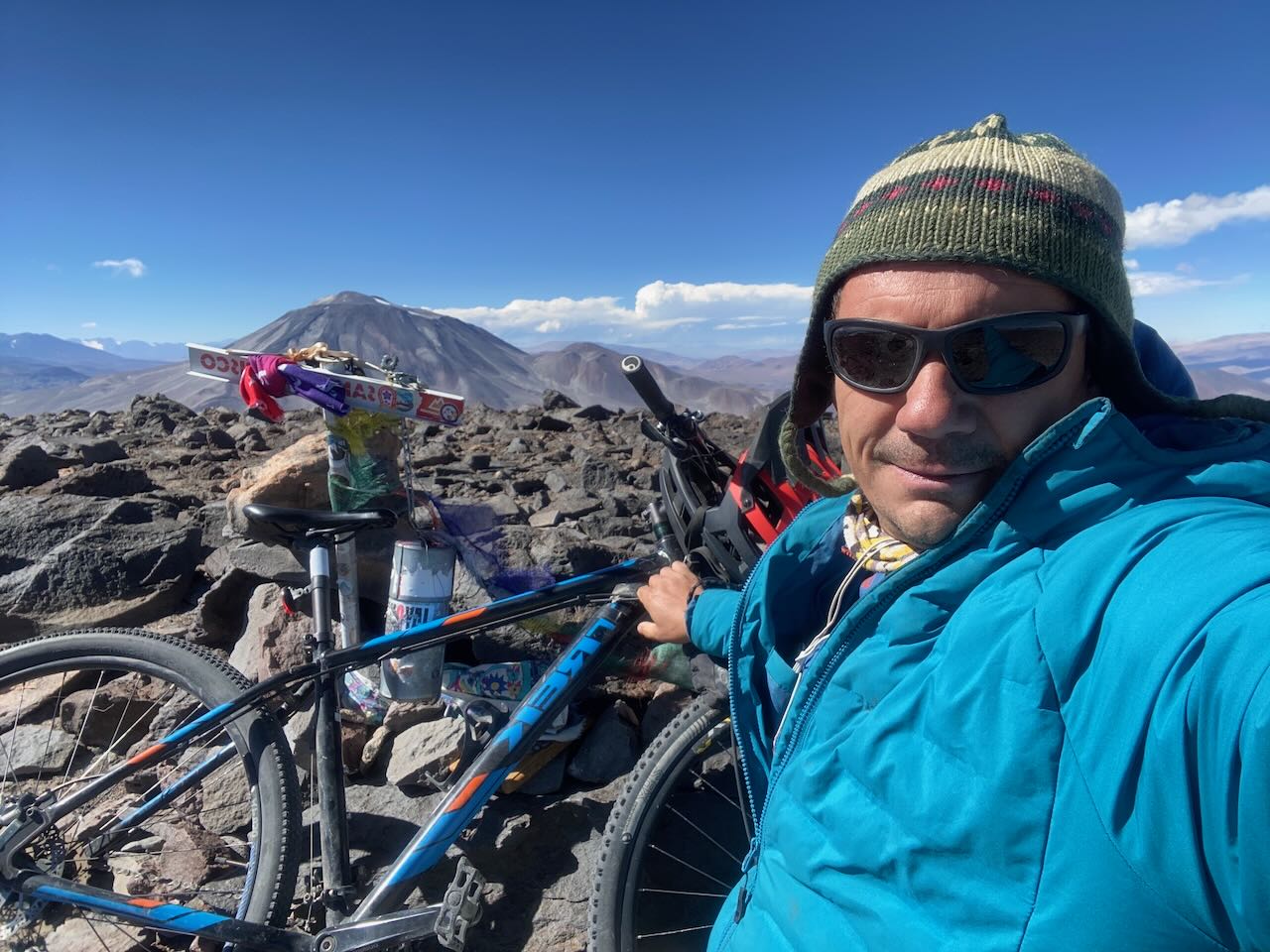 Ascenso empujando la bici hasta la cumbre. Casi nada de viento, lindo día. Pesada la subida, pero notable la bajada!