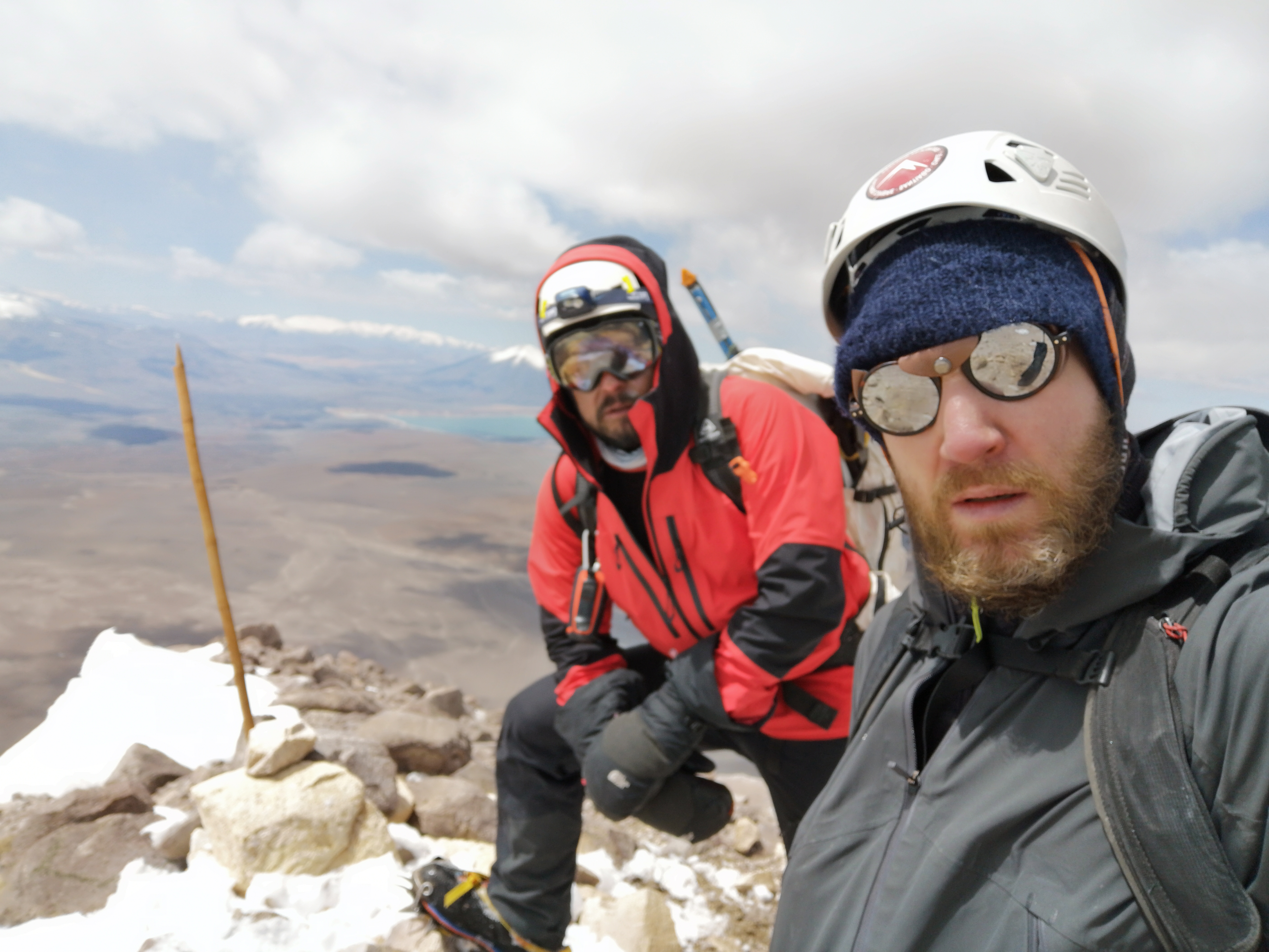 Foto Cumbre El cerro contaba con algunos puntos con nieve que facilitaron la subida por el acarreo. En el primer tramo desde la base bajo las piedras había hielo por lo que usamos crampones. Saliendo del acarreo, la ruta presentaba bastante nieve blanda hasta la base de la cumbre. Usamos un campamento a 4.900 metros apróx.