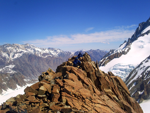 Cumbre en el Pilar Occidental, foto tomada desde el torreón este, hacia el central. Noviembre del 2013. Hermosa vista, cumbre lograda en al marco de la Beer Machine Climbing 2013, expedición que en un mes de "trabajo" logró otras 7 cumbres en el sector de los Glaciares Universidad y Cortaderal. Cuarto ascenso y nueva ruta "Canalón del Conejo Playboy", homenaje de los Perros al gran Hugh Hefner!!!