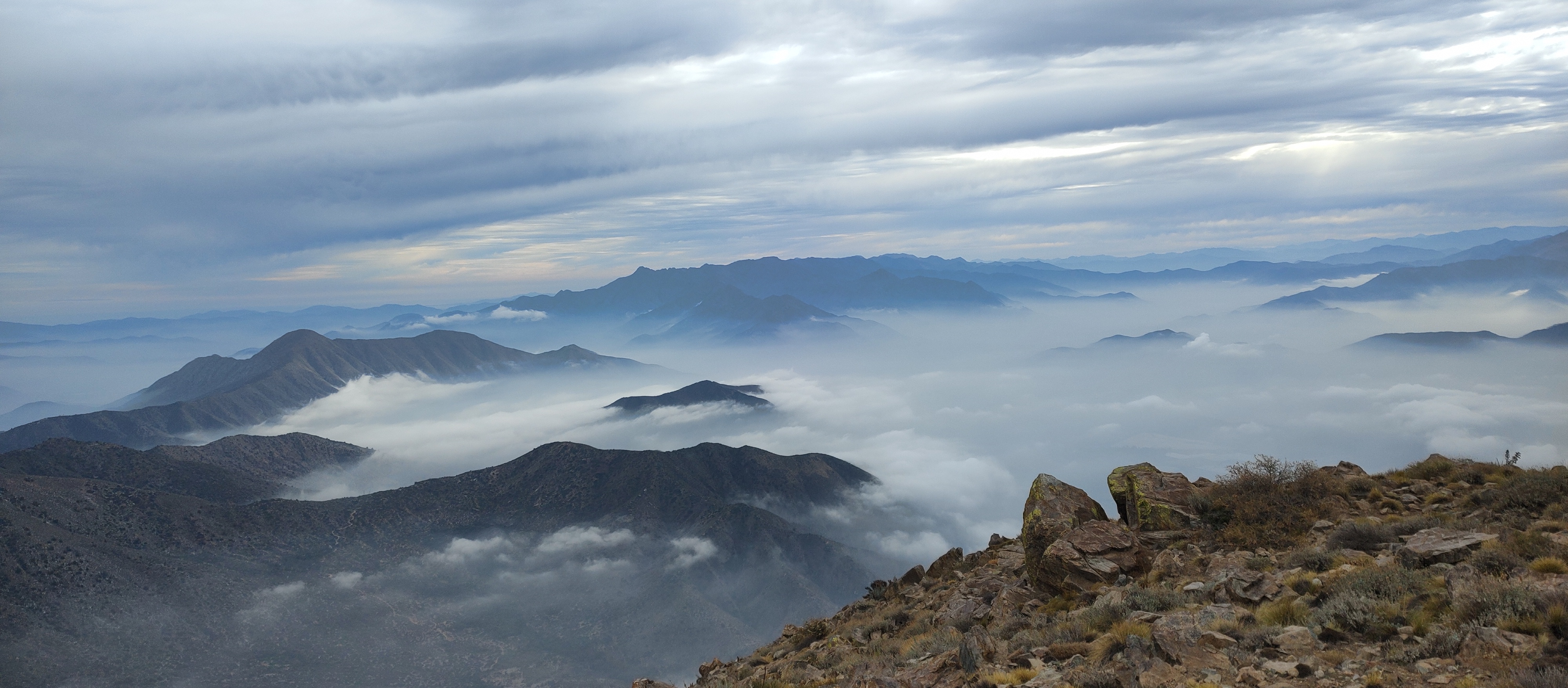 El primer tercio de la ruta es el más complicado considerando que prácticamente no hay sendero, la vegetación nativa es muy espesa, hay sectores con rocas y algo de erosión. Actualmente no hay ninguna señalización y la única referencia es el cerco al norte (precaución ya que en este sector limita con algunos farellones hacia el norte) y hacia al sur hay una quebrada (no seguir). La ruta que sigue por el filo es clara y evidente, sin embargo, hay densos arbustos bajos y rocas por lo que se debe cuidar el paso. Conviene sortear el frontón rocoso antes de la cumbre por el lado sur. Es imprescindible el uso de bastones. Se recomienda portar linterna frontal por si la excursión pudiese terminar después del crepúsculo. Ser amable con el dueño de la casa del portezuelo, donde se puede estacionar. La composición de la foto muestra una vista al primer tercio de la ruta y a la derecha, el restante filo desde la cumbre (20-5-2018).