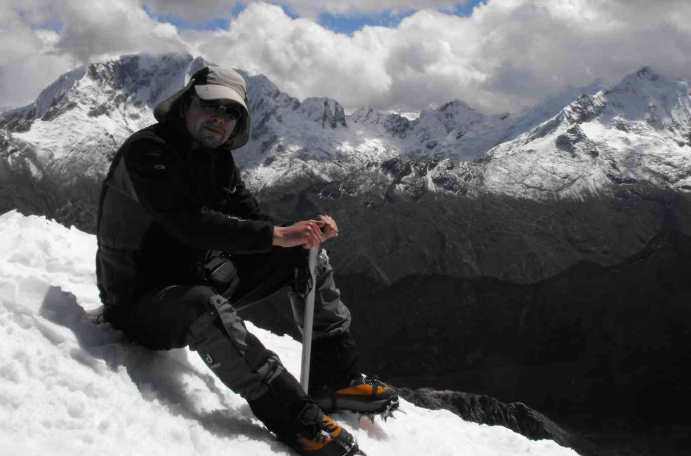 Rodolfo en la cumbre de URUS Excelente cerro, especial para aclimatación, tiene harto ángulo especialmente al final donde hay que valerse un poco del piolet para llegar más fácilmente, generalmente se hace en 3 días este cerro junto con el Ishinca ya que tienen el mismo CB en común