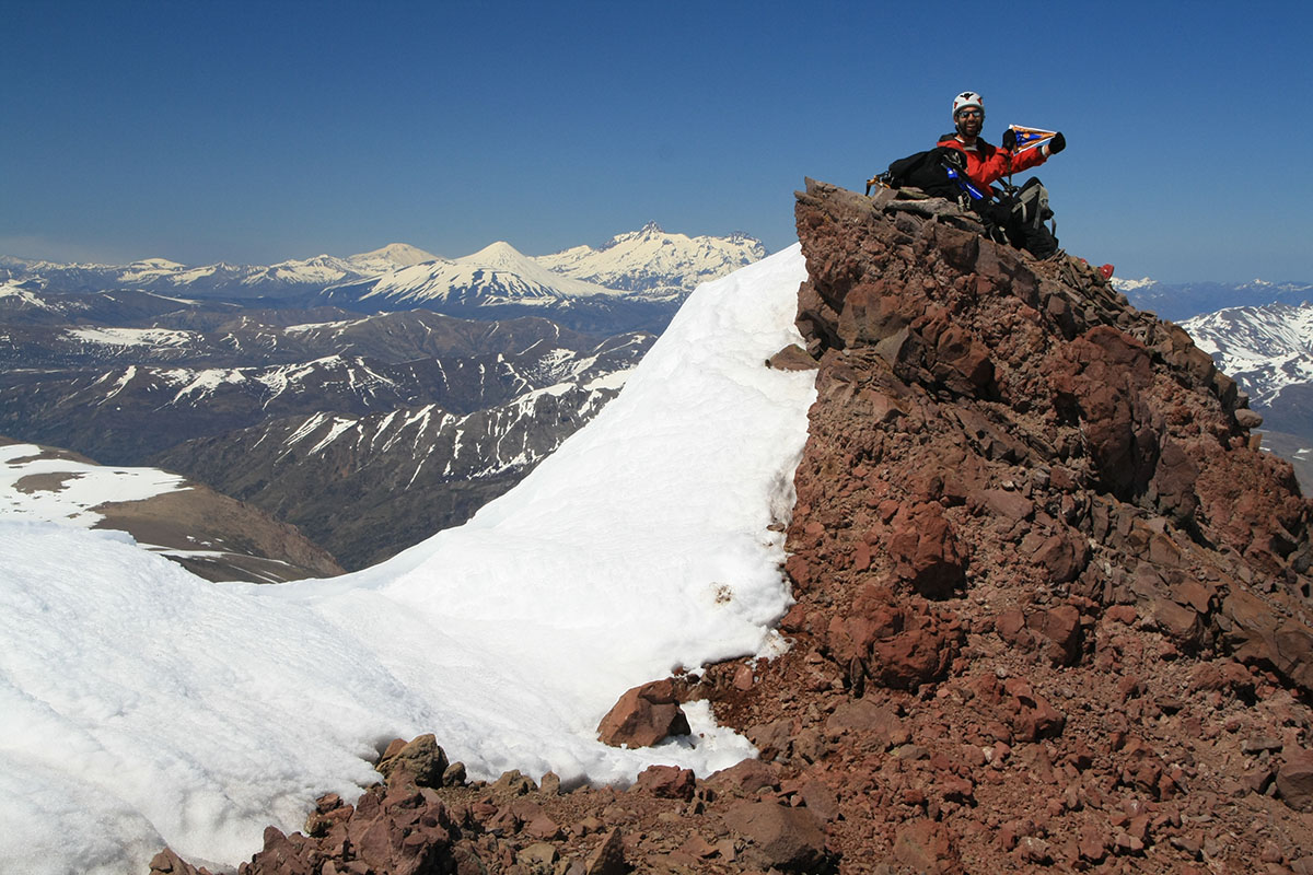 Cumbre del Cerro Las Águilas y la vista hacia el sur con el Volcán Antuco y Sierra Velluda. El Club de Montaña RAUC vuelve a hacer cumbre en esta cumbre de la región del Biobío. Una larguísima aproximación desde Termas de Chillán pasando numerosos pasos y esquiando laderas increíbles y desconocidas. Requerimos 3 días y medio para hacer cumbre y regresar. (ruta Termas de Chillán-Torre 25-azufrera (sin descender al valle de aguas calientes)-Portezuelo entre Cerro Metales-Cerro El Feo-Valle las Águilas-Cerro Las Águilas-cumbre y regreso pasando por los baños de Aguas Calientes). Se recomienda ir con tiempo para agregar también la cumbre del Cerro Los Metales, aunque el esfuerzo físico de la ruta planteada ya es muy elevado. Imposible de realizar sin esquies esta ruta. En caso de ir "a pie" es mejor pensar en ascender desde el Valle Ñuble.