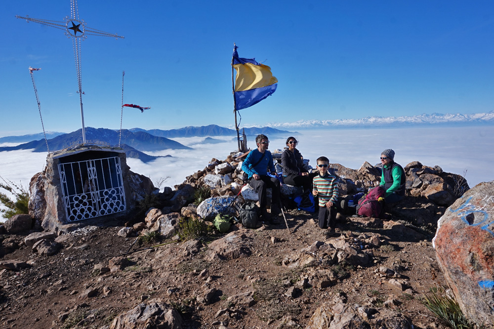 Empezamos a subir con mucha neblina sin poder ver el cerro. Cuando llegamos arriba teníamos el mar de nubes abajo y una vista extraordinaria allá arriba. Aunque la cruz no es el punto más alto, ahí nos sacamos la foto de cumbre.