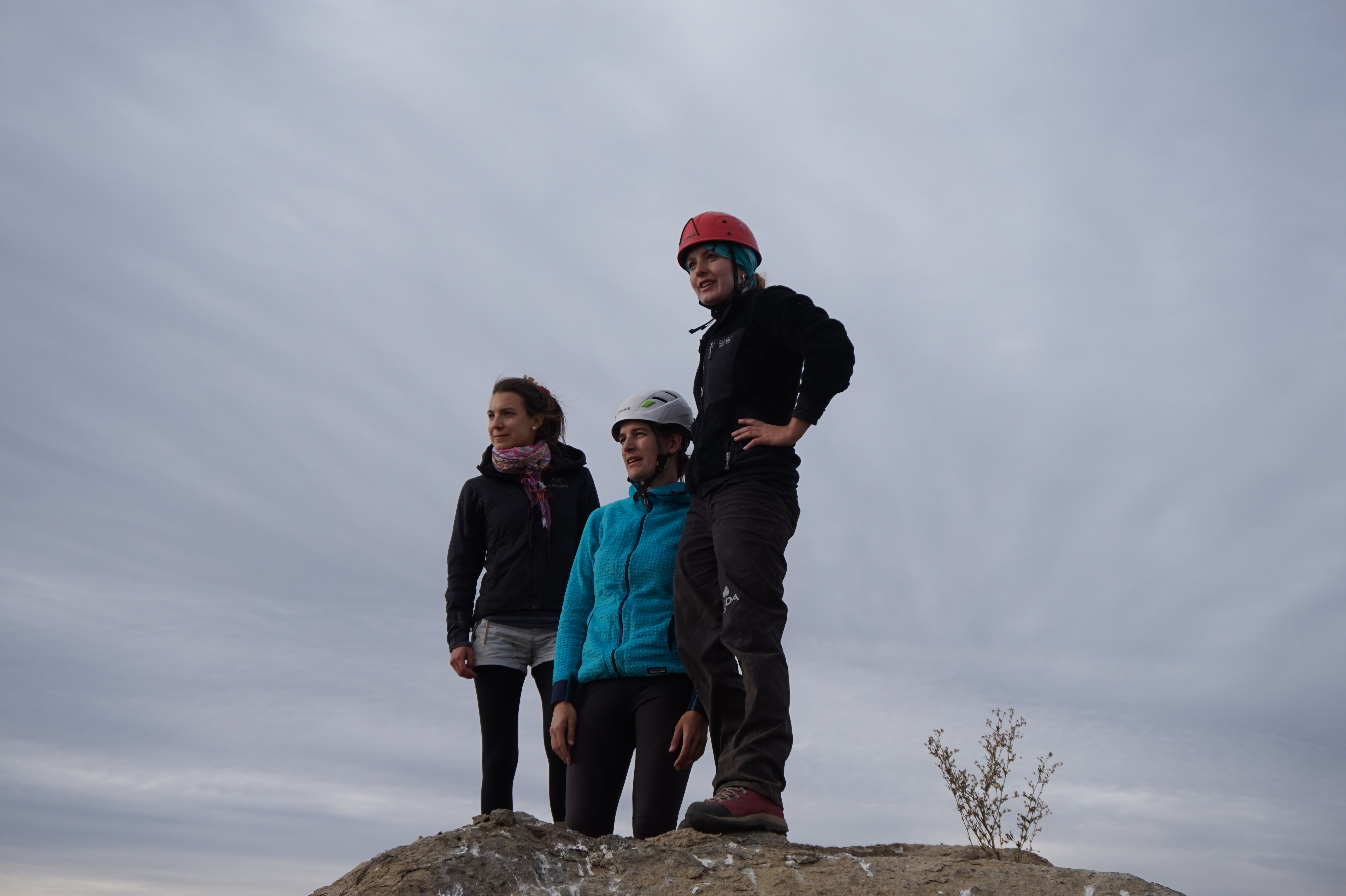 La Cristi, la Vale y la Berni, después de una larga jornada de exploración hasta la cumbre principal. Salimos desde Santiago el sábado 12 de mayo, muy temprano. Condiciones buenas de tiempo, con nubosidad alta hacia el final del día. Día muy típico de otoño. Poco antes de las 10am iniciamos el ascenso. Muy entretenidos trepes de roca, especialmente cuando pasamos por los caminos del Hobbit (sector muy característico de la ruta, antes de abandonar el filo que conduce al circo de torres del Agujereado). Íbamos un poco en modo exploratorio. La Cristi y Paulo habían ido, cada uno por su cuenta en diferentes expediciones, al primer torreón, que claramente no es el más alto. Esta vez había que probar entre el segundo y el tercero que siguen hacia el Este. No estaba muy claro desde la base de los torreones, pero claramente se veía más accesible el último torreón, y se optó por int
