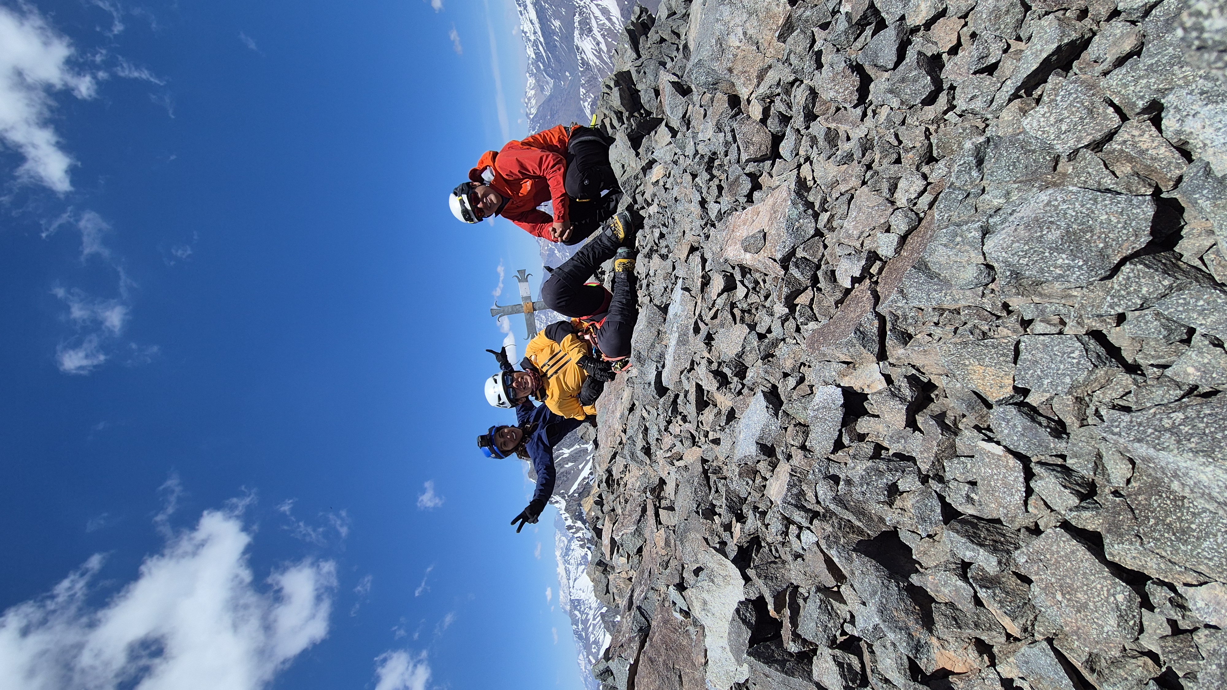 Cordada en la cumbre Hermosa y entretenida ruta, tiene de todo un poco. La canaleta con nieve en buenas condiciones, salvo un tramo como a su mitad en donde el sol le pega de lleno apenas amanece y la nieve se vuelve sopa, creo que fue el tramo mas agotador. Mejora bastante cuando ya se enfila hacia el final y se ve la cornisa. La escalada es sencilla, el unico detalle como se menciona en la descripcion, es lo malo de la roca aunque igual dió para poner unos cuantos seguros (friends)