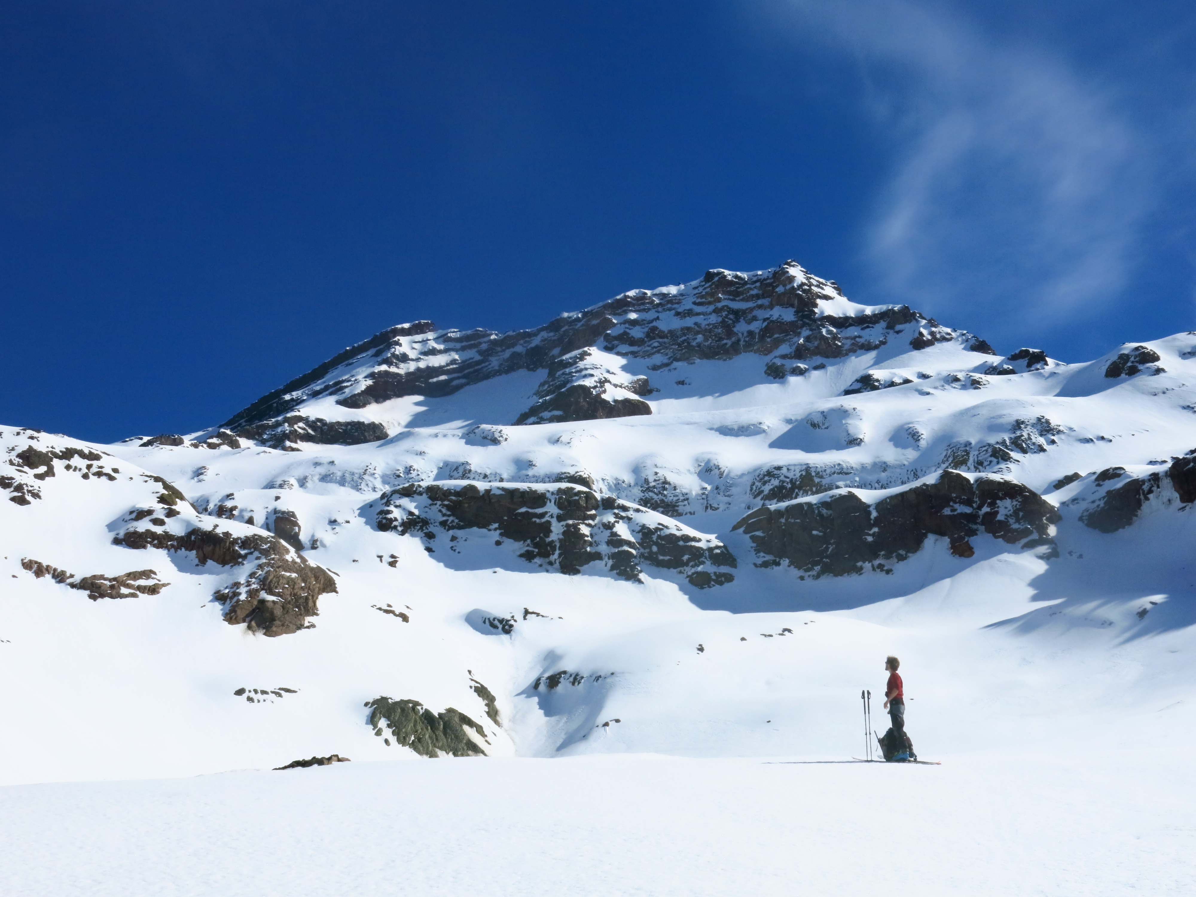 Ruta realizada con esquis de randonné. porteo hasta el final del llano detras de la laguna. una doble corniza a superar para montarse en el filo cumbrero. La ultima placa cumbrera muy helada se realizo en crampones.