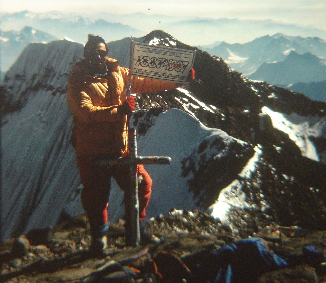 Perfecto día antes de la tormenta, los últimos expedicionarios en cumbre pasadas las 17hrs. Solo tercera capa y polera debajo.