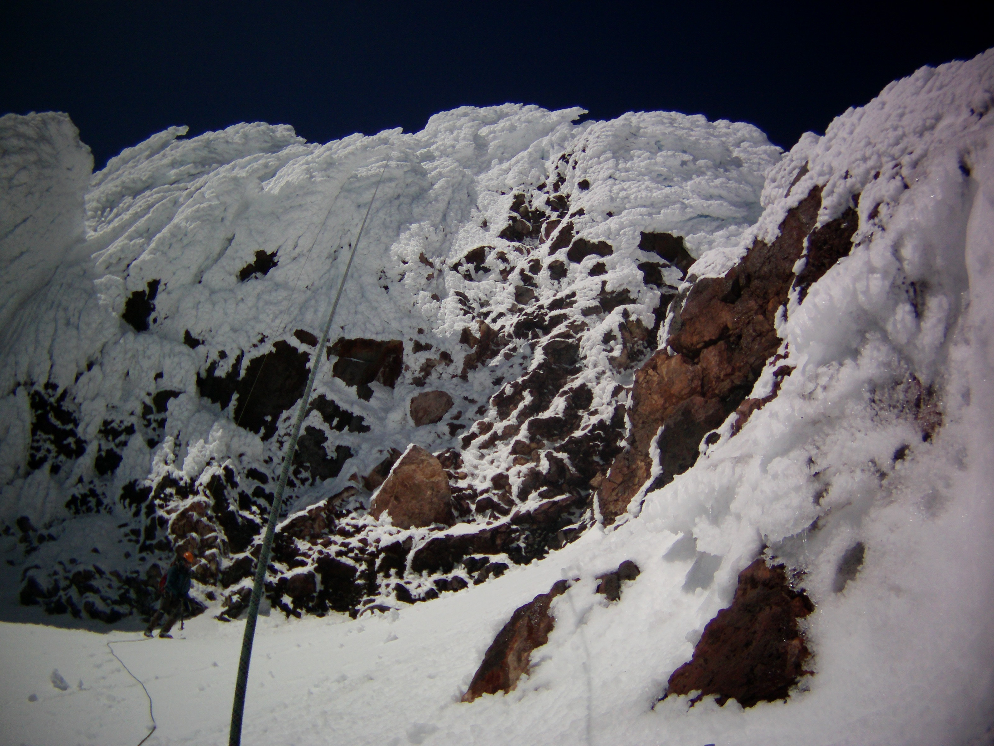 Encontramos material y una reunión de clavos en la ruta, lo que nos facilitó sobre todo al momento de descender. Comenzamos a caminar a las 5:30 am debido a que en la madrugada llovía, y sólo después de las 04:00 am dejó de llover, esto hizo que en el último largo la nieve estuviera algo blanda. Recomendable salir más temprano, entre las 2 y las 3 de la mañana.