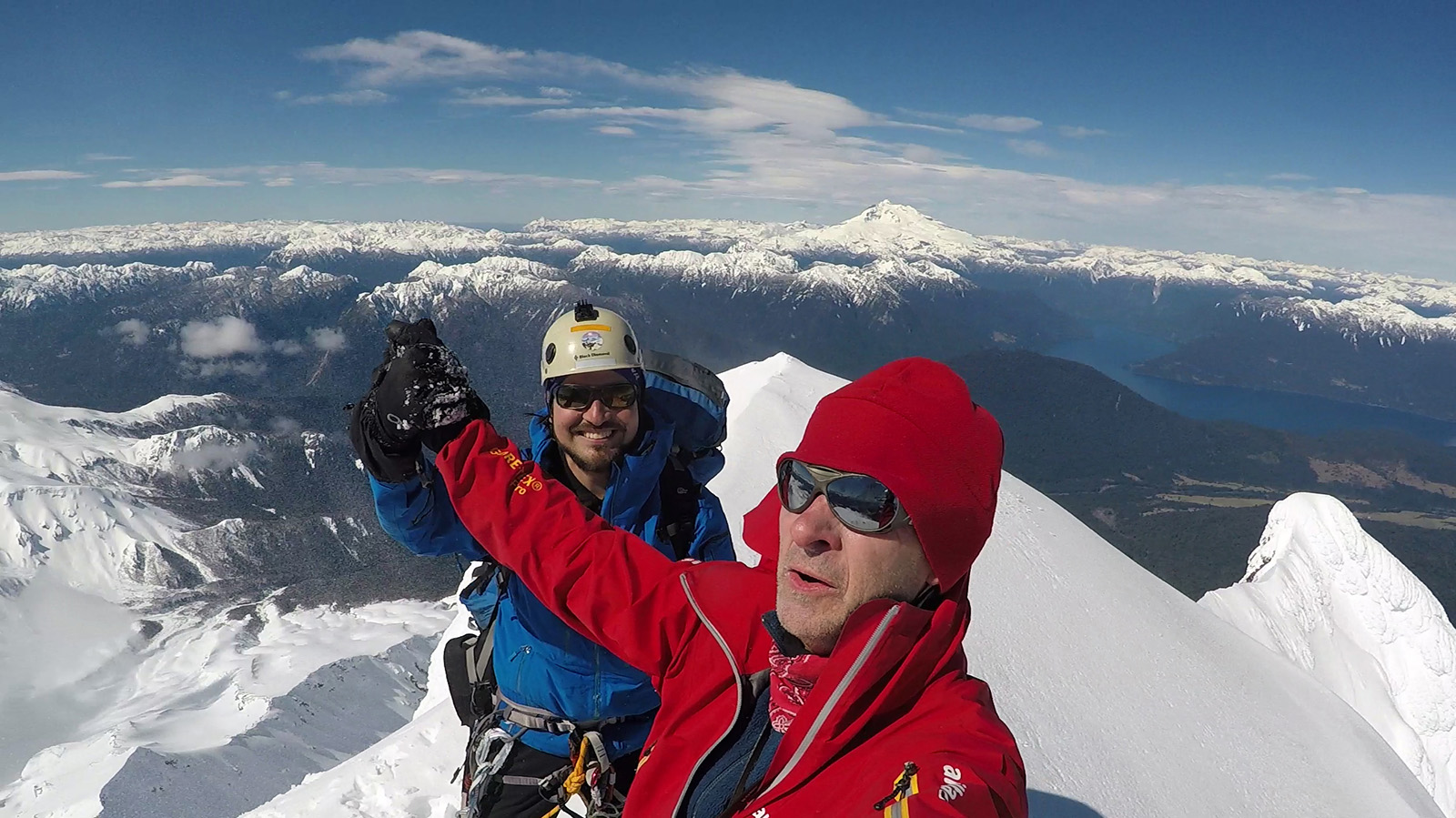 El tercer largo se inicia con la escalada de una pared de hielo vertical, para muchos el crux de la ruta. Fotografía tomada hacia el Sur, septiembre 2015.