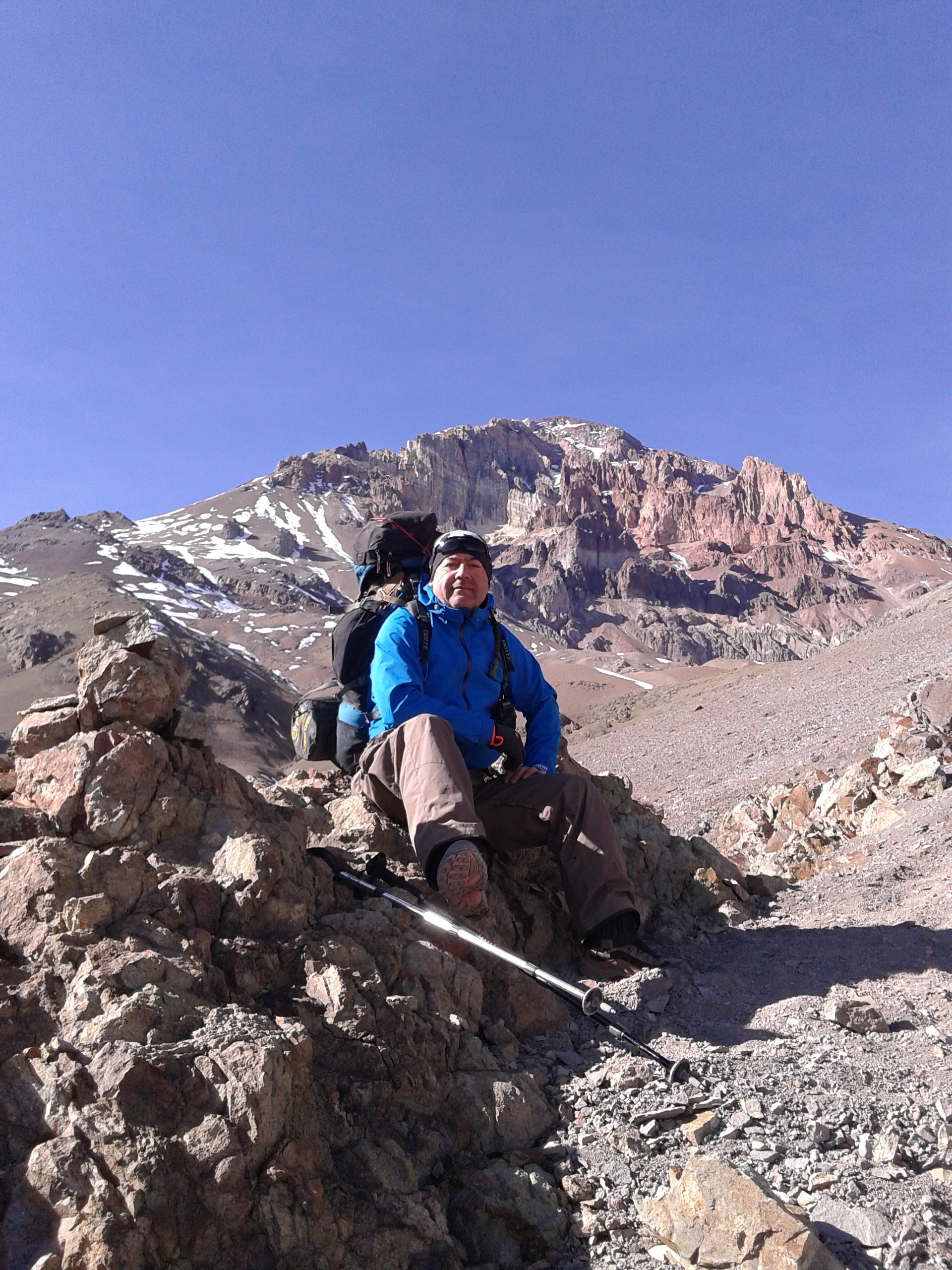 Todo esfuerzo tiene un sacrificio Mayo día 13 año 2023 Mi primer 6 mil. Este gran viaje lo iniciamos 4 días antes de hacer cumbre, no prepararme físicamente fue una de las causas de agotamiento, primer día en termas las hediondas camp 1, día 2 día sector escarchales tomamos nuestras mochilas porteando agua y alimentos desplazamientos al refugio Gabriela Mistral se hizo bastante duro el trayecto al llegar al refugio sobre los 5.200 no dormí casi nada vomité lo que comí en la noche, solo me hidrate en la mañana antes de salir, mis ganas eran infinitas pero en la noche dudé en mi mal estado (puna), mi compañero presentó los mismos síntomas. Eran las 8:45 en el refugio Gabriela Mistral y teníamos miedo de comer y vomitarlo, solo nos hidratamos bastante y salimos a las 10 de la mañana a tomar la cara norte