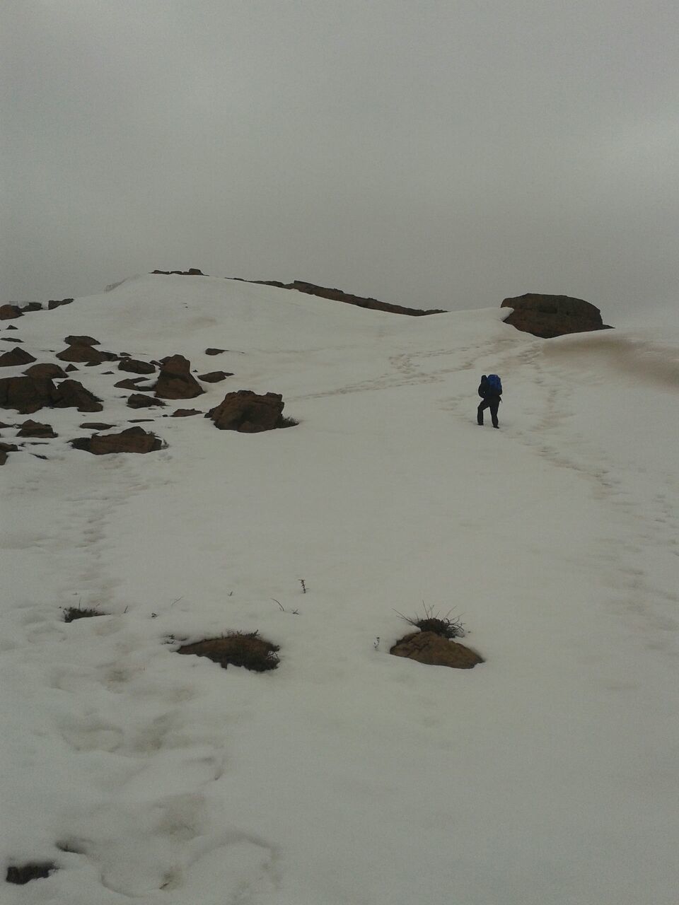 Tranquila ascensión del Durazno. No pudimos disfrutar de la vista: cielo cubierto, bien oscuro hacia la cordillera alta. Bastante ventoso en secciones del filo y algunas leves e intermitentes precipitaciones de nieve llegando a la cumbre.