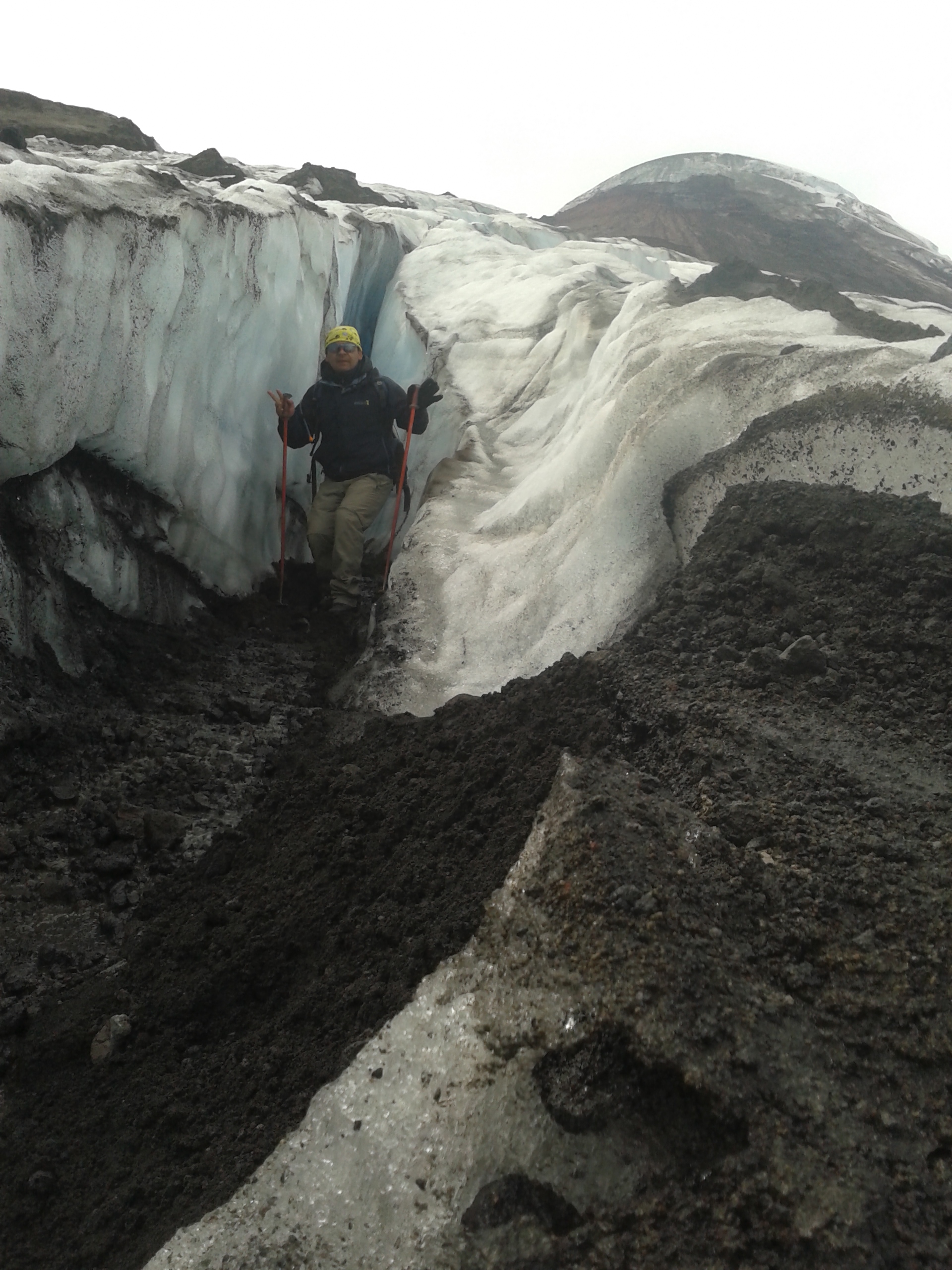 . Nieve solo en el cono superior, ninguna presencia de grieta o rimaya visible. Subimos por una linea directo hacia arriba. Solo en la parte final antes de llegar a la explanada de cumbre, nos tocó nieve/hielo más dura]o (3-4 metros). Bonito volcán con una excelente vista.