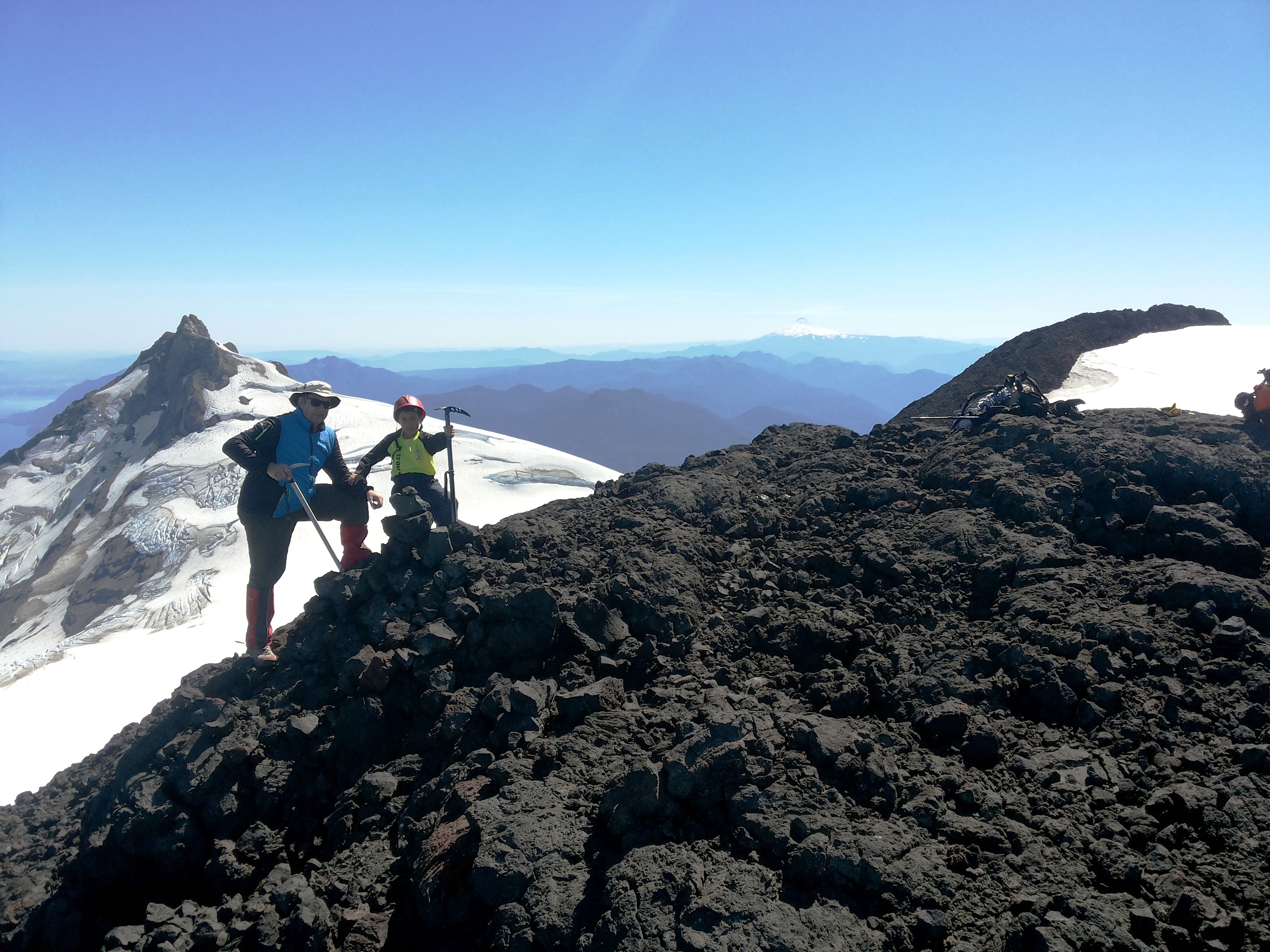 Hermanos Juan y Dante Cox, 16 y 13 años respectivamente, por primera vez juntos en la cumbre del Mocho. Día despejado con poco viento durante todo el día. Altas temperaturas. Partimos desde el camping/refugio concesionado por Conaf en Río Blanco (por Enco). 1h aprox. al mirador de la Tumba del Buey, y poco más de 2h a la montada al glaciar. Desde ahí todo se demoró mucho. El glaciar se encuentra muy retrocedido, abierto y resquebrajado. Nidos de grietas por todas partes. Hay que realizar una travesía encordados y con piolet y crampones. Nosotros creímos mejor ascender hacia el sureste, por donde creíamos que había menos grietas y la travesía era por neveros planos. Pero error. No hay que innovar. Lo mejor (y que comprobamos a la vuelta) es hacer la travesía por donde discurre la ruta siempre (ver track), en diagonal hasta la lengua de nieve bajo el espolón que sube a la cima en